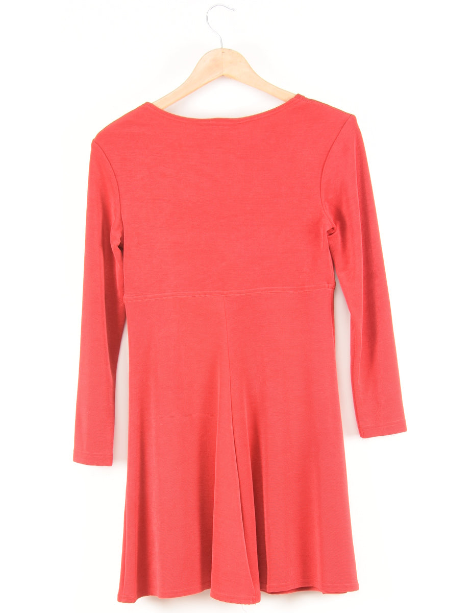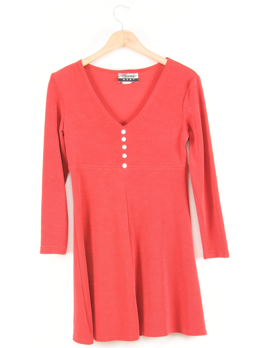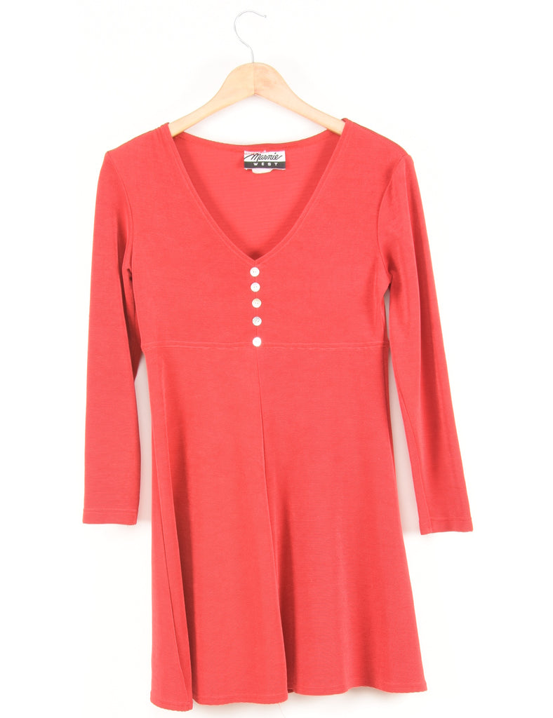 Long sleeved mini dress comes in red with decorative buttons and a v-neck.