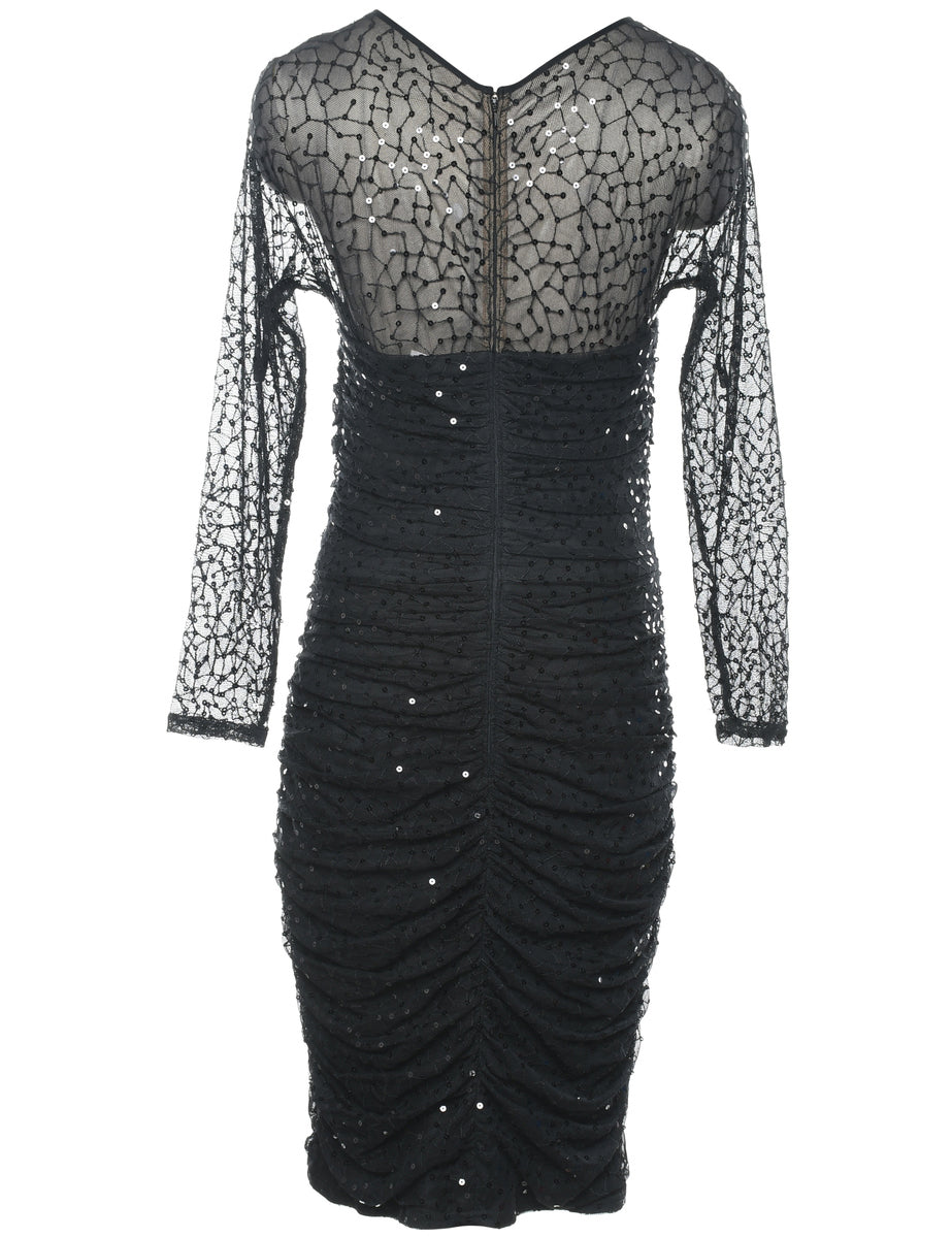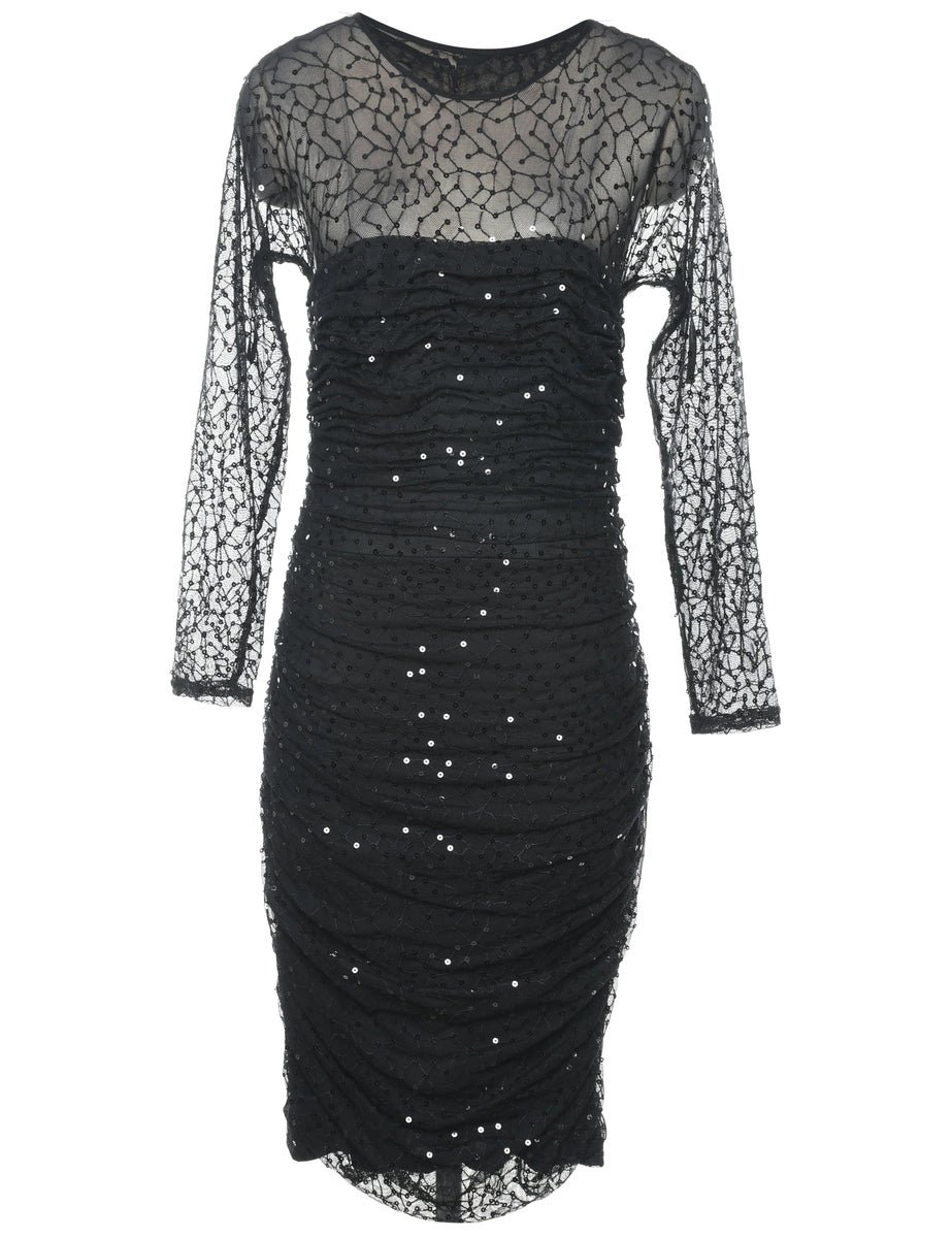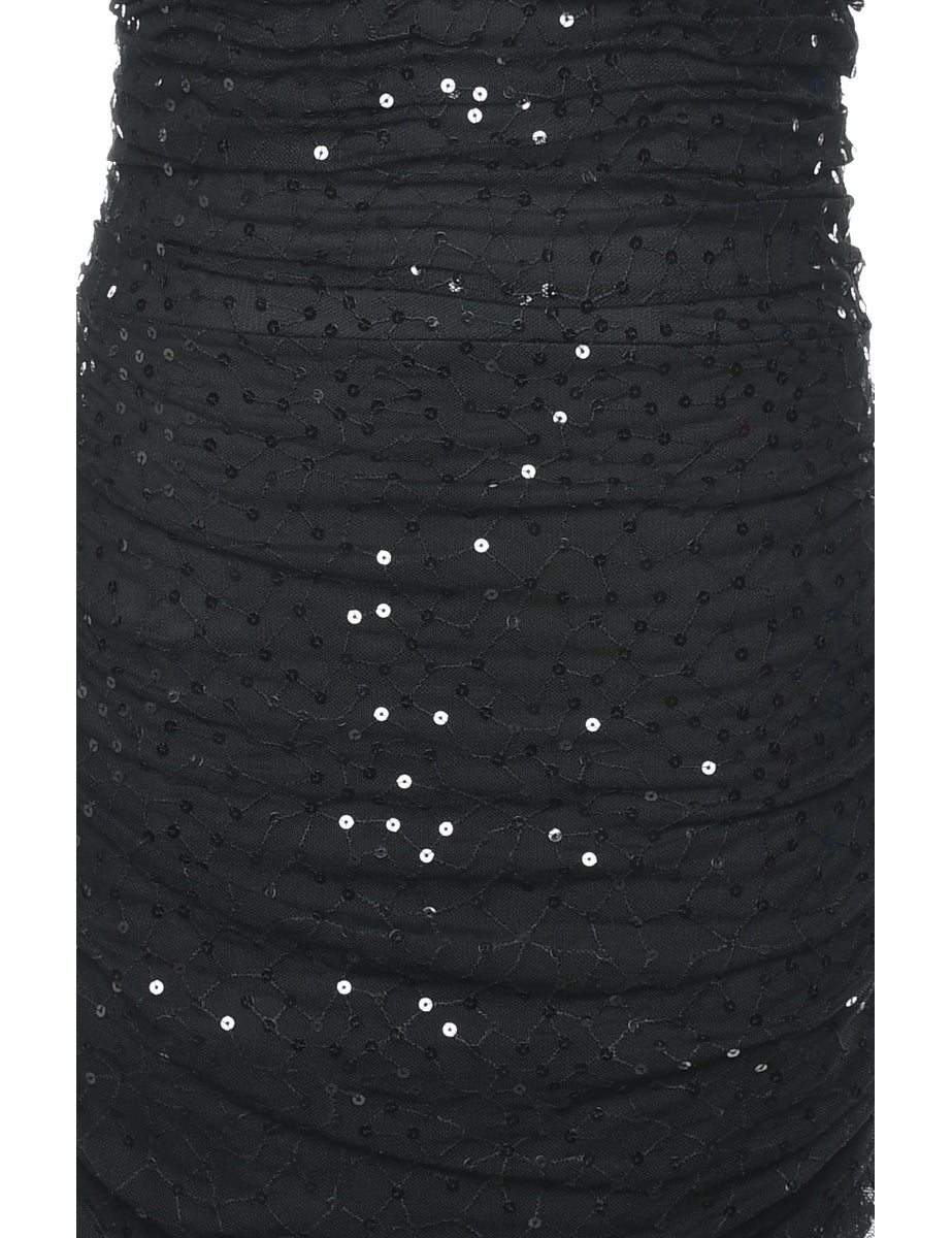 Sequined party dress in black with fitted shape, a round neck and a pencil skirt.