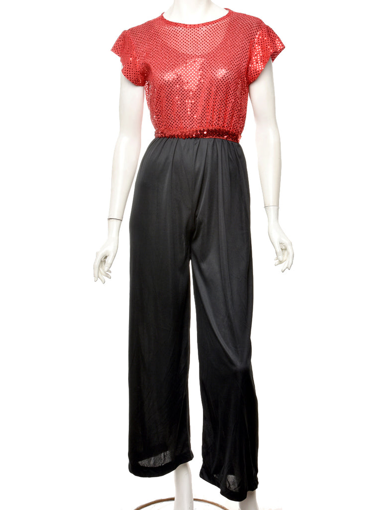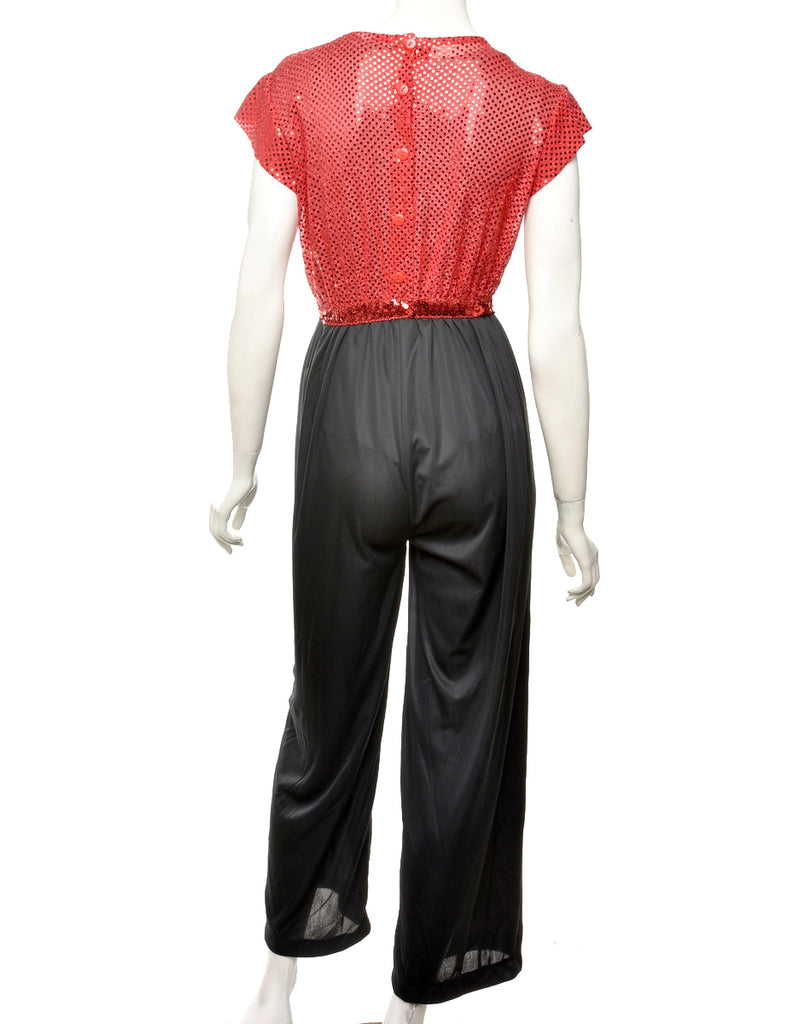 Sequined jumpsuit. Comes in red & black with an elasticized waist.