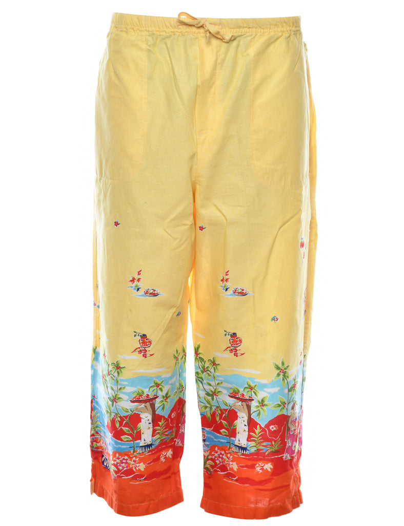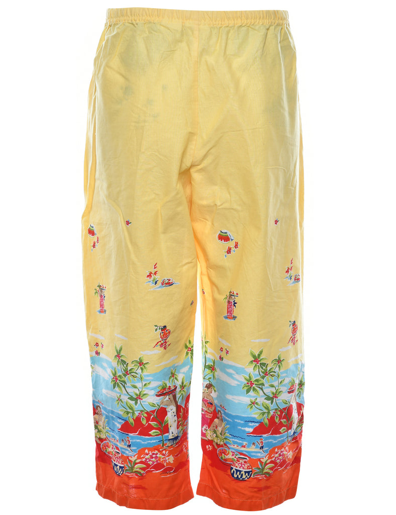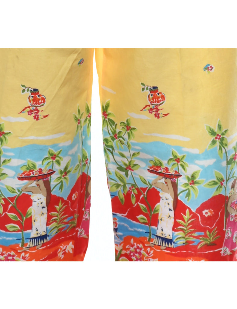 Tropical Scene Trousers in yellow with an elasticized waist.