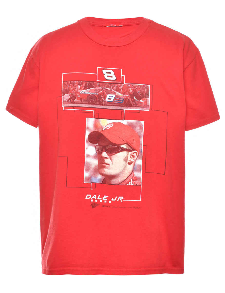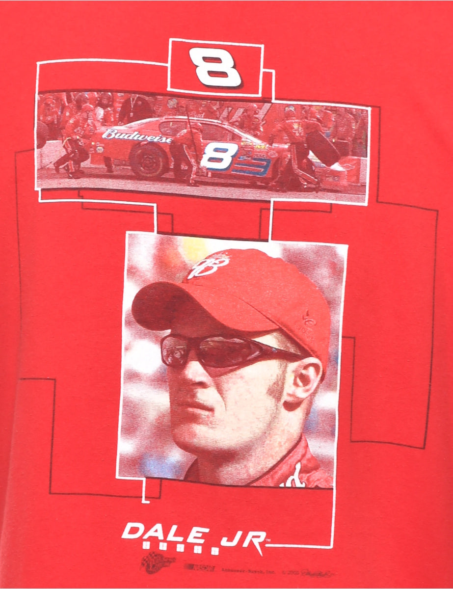 Red t-shirt with car racing print.