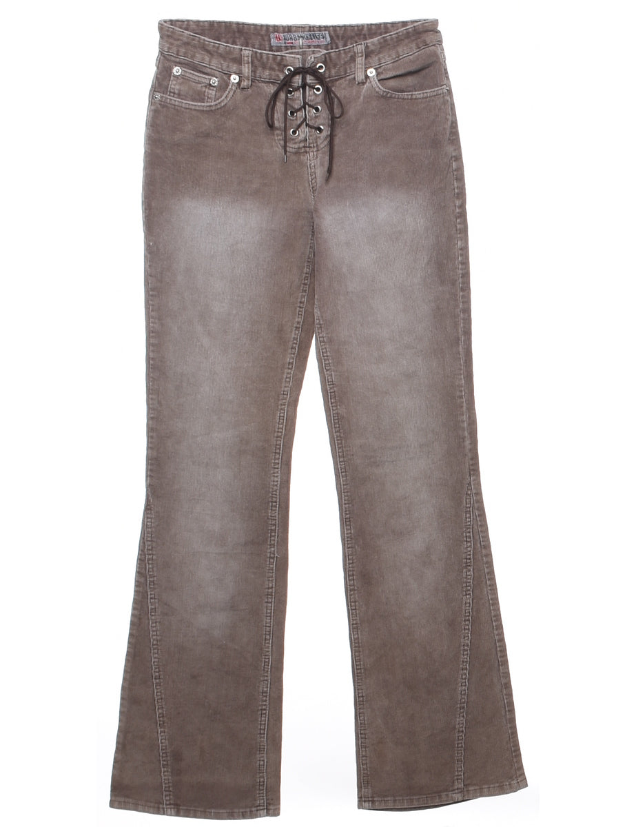Flared leg trousers with corduroy fabric comes in beige with multiple pockets and a waist tie.