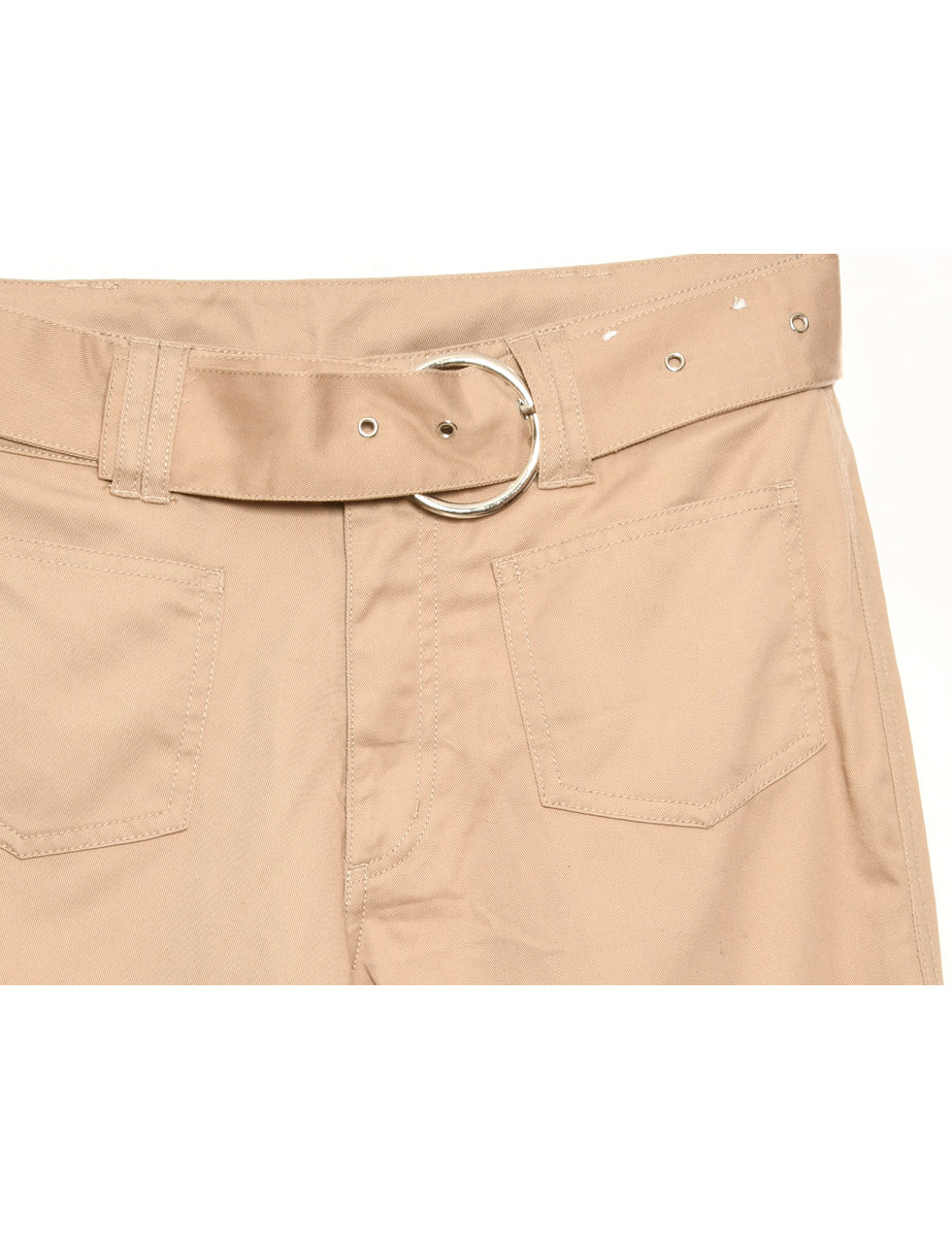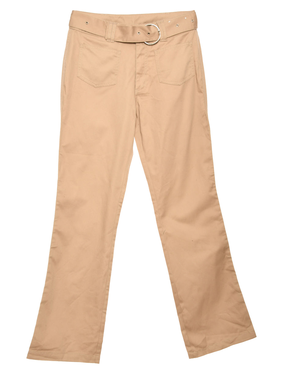 Cream flared trousers complete with two pockets and a chrome belt.