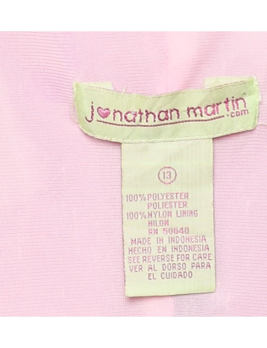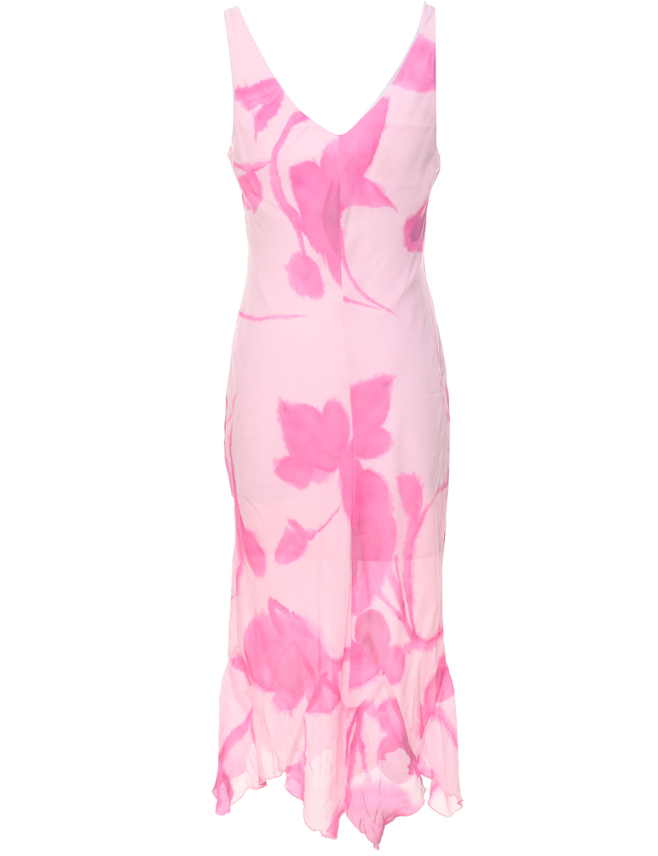 Floral print pale pink dress with a handkerchief hem.