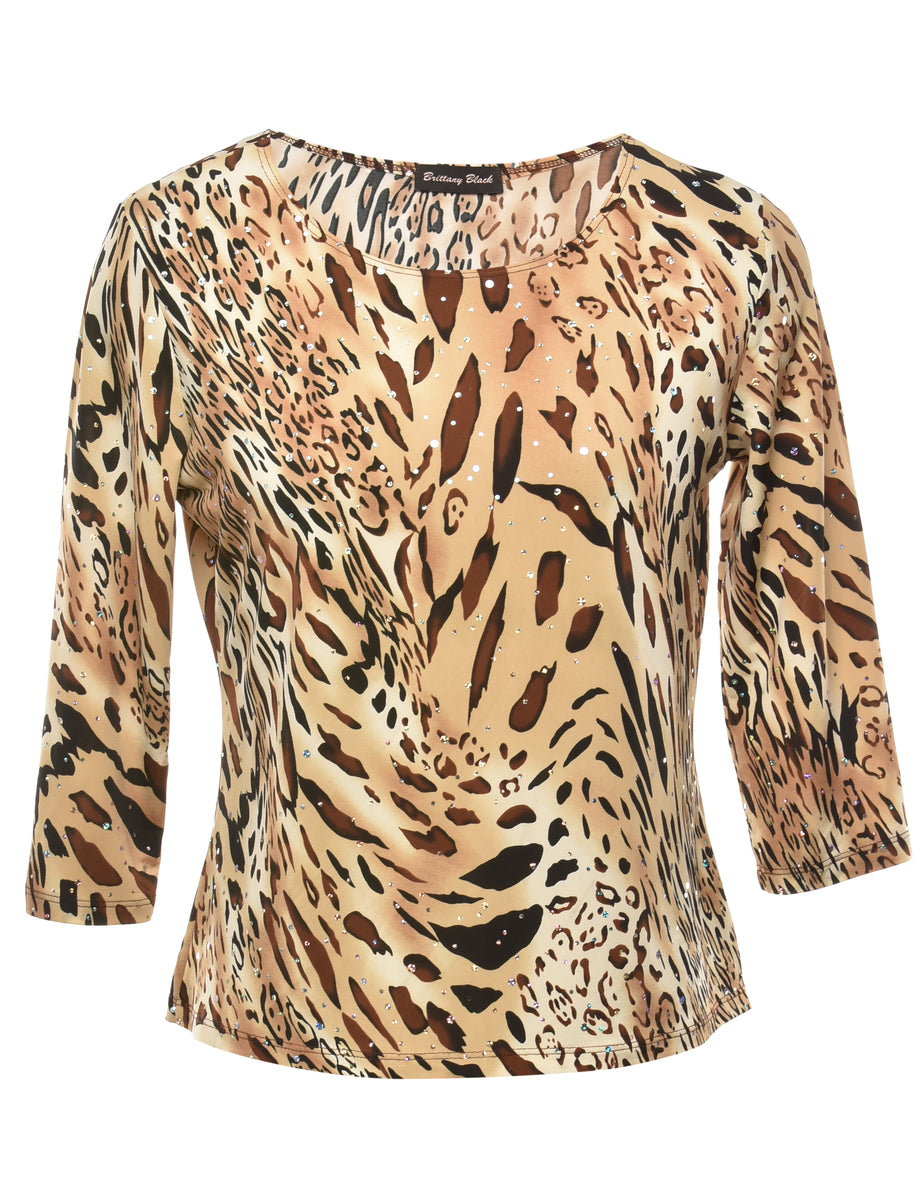 Leopard printed top in brown with a round neck.