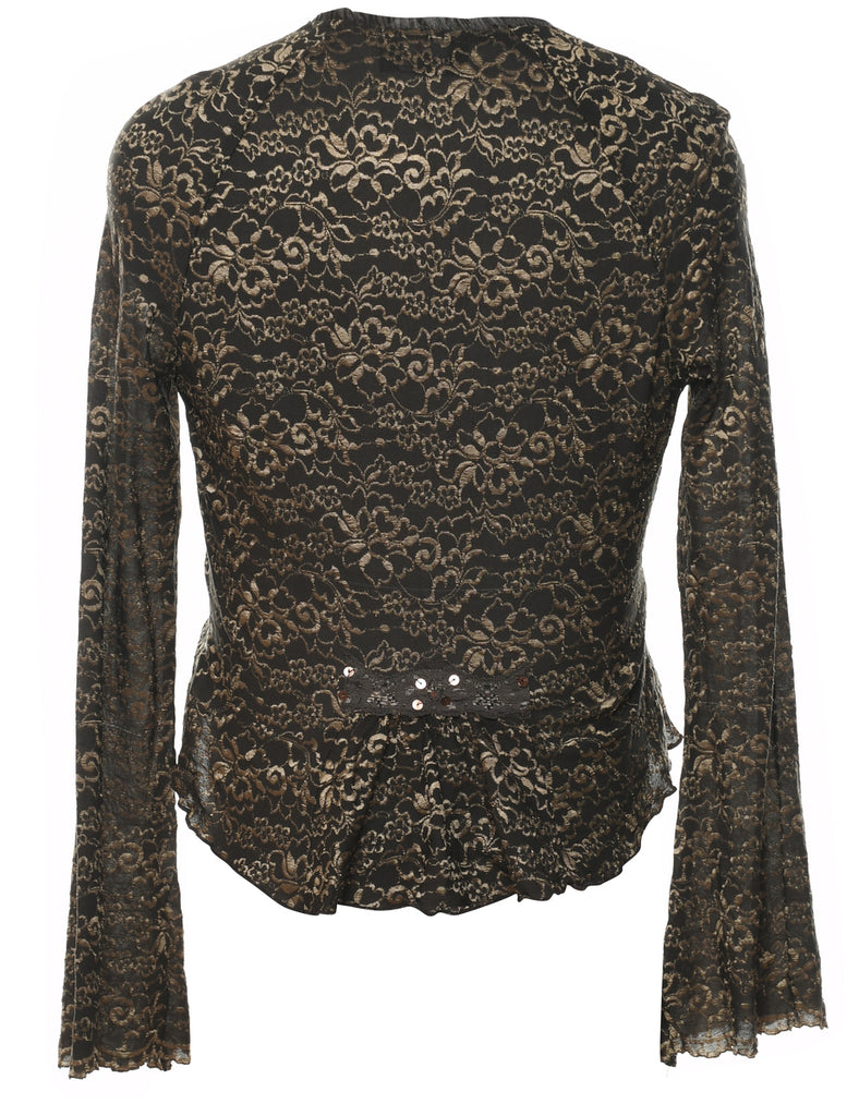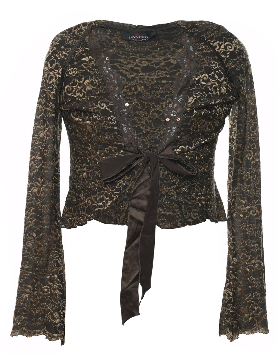 Olive Green & Gold Floral Lace Tie-Front Y2K Blouse - M