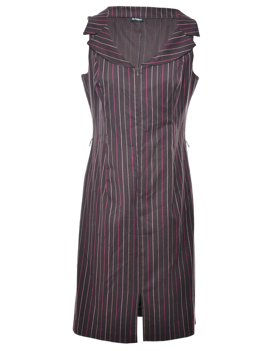 Pinstriped sleeveless dress comes dark brown with a a revere front.