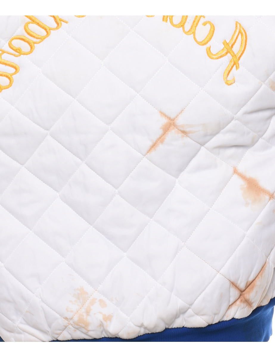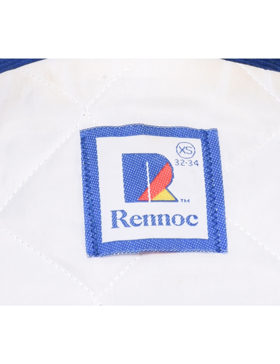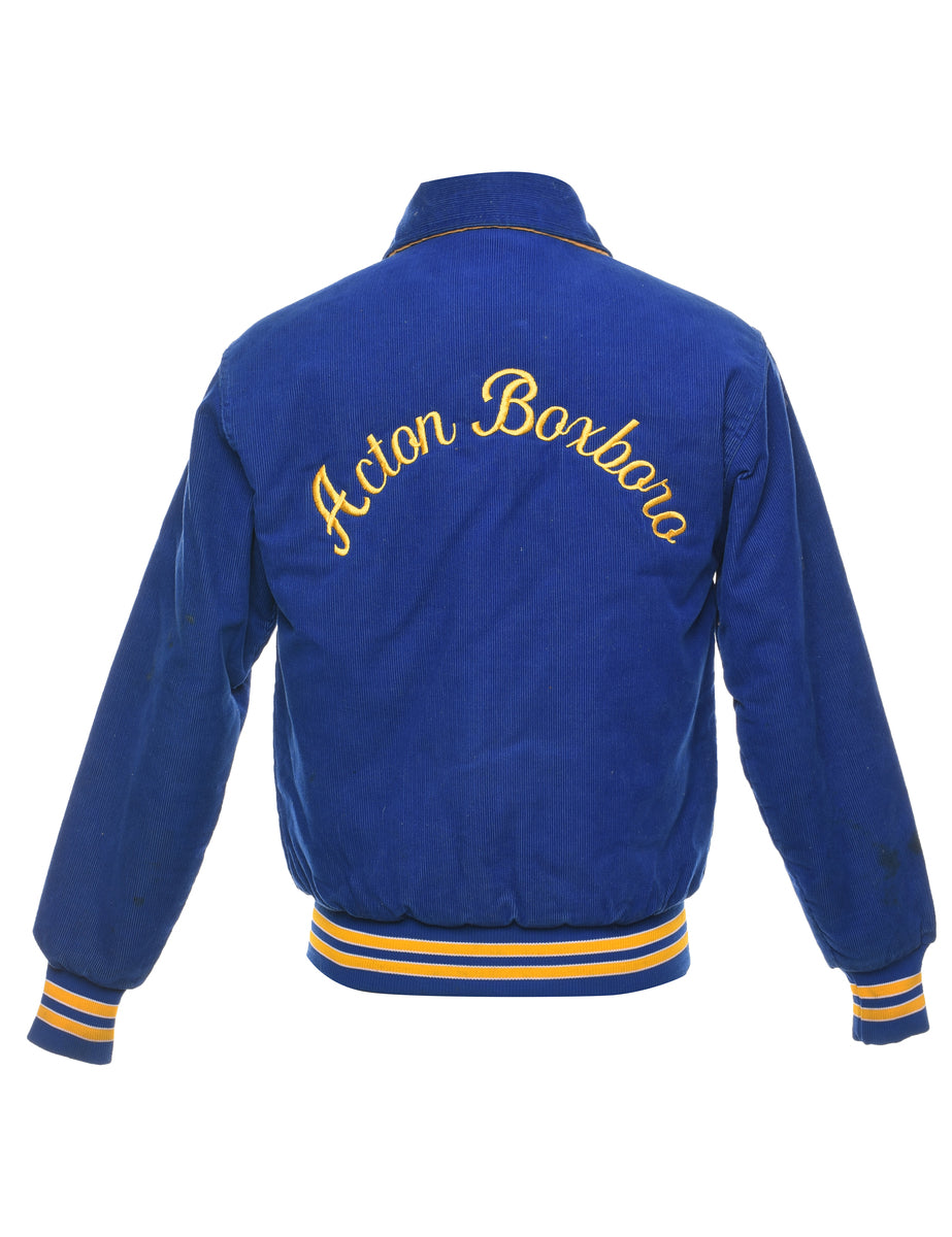 Corduroy team jacket. Comes in blue with quilted lining and multiple pockets. stains on linning but otherwise in good condition.