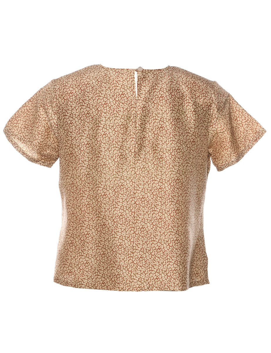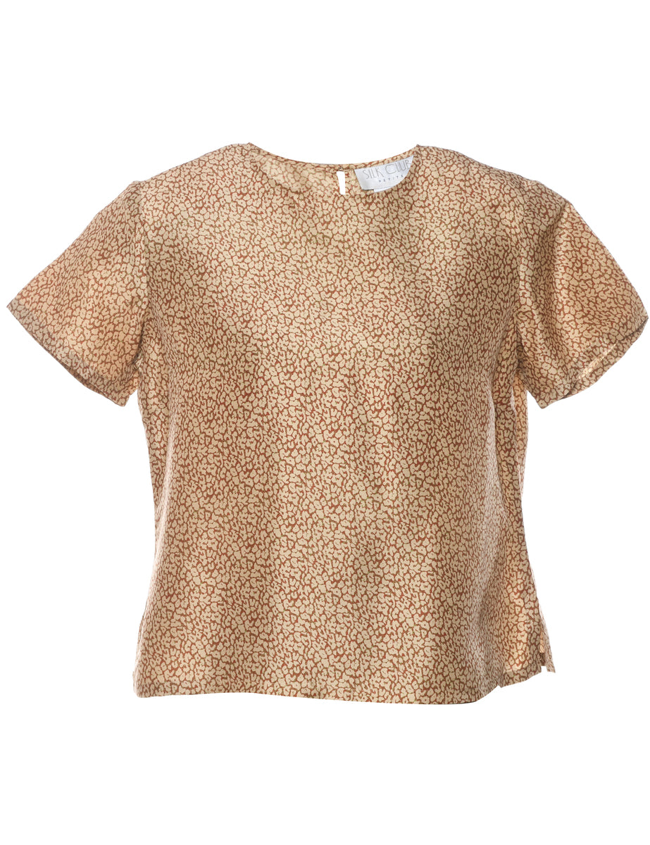 Animal print tan silk top with a round neck.