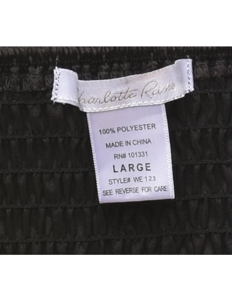 Lace corset. Comes in black & red with a built-in-bra and sequins. The size label mentions L but based on the actual measurements we consider it a size S.