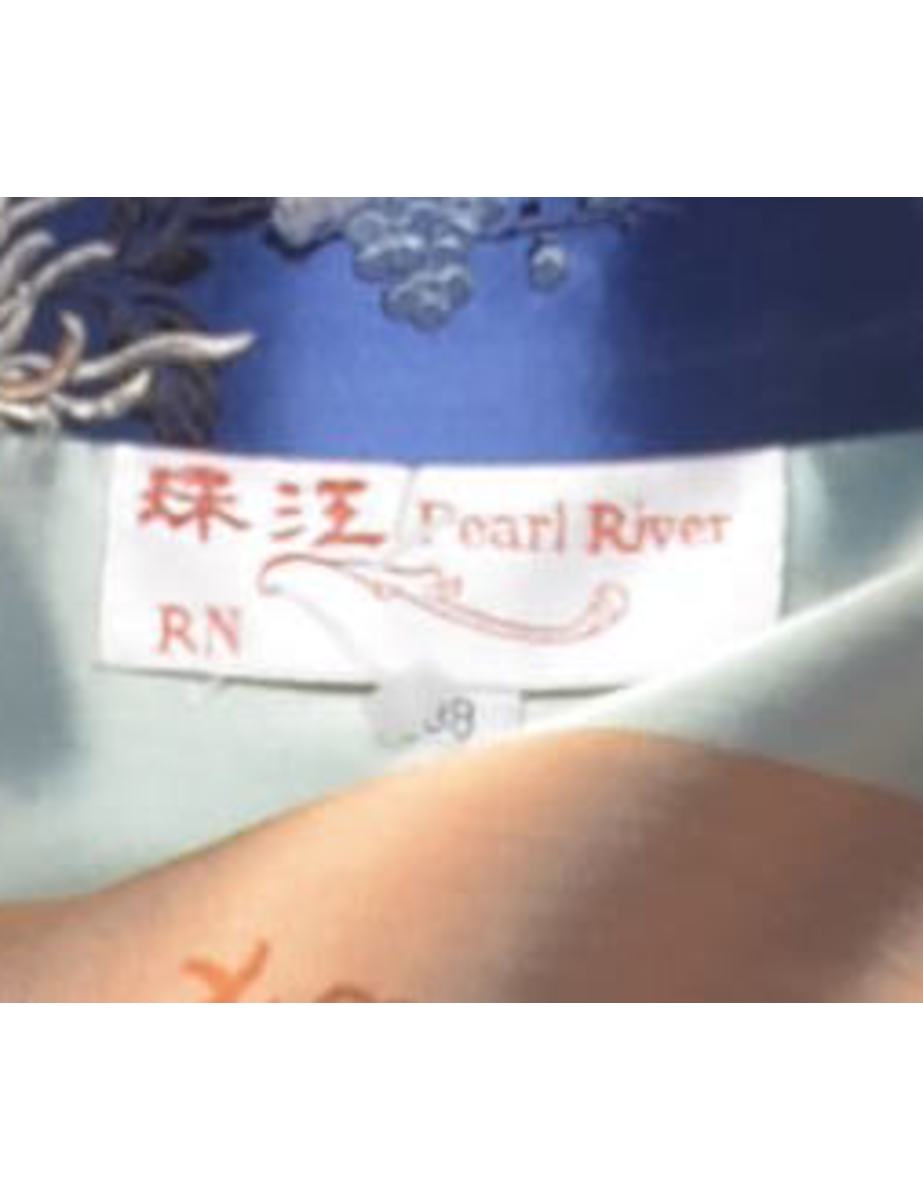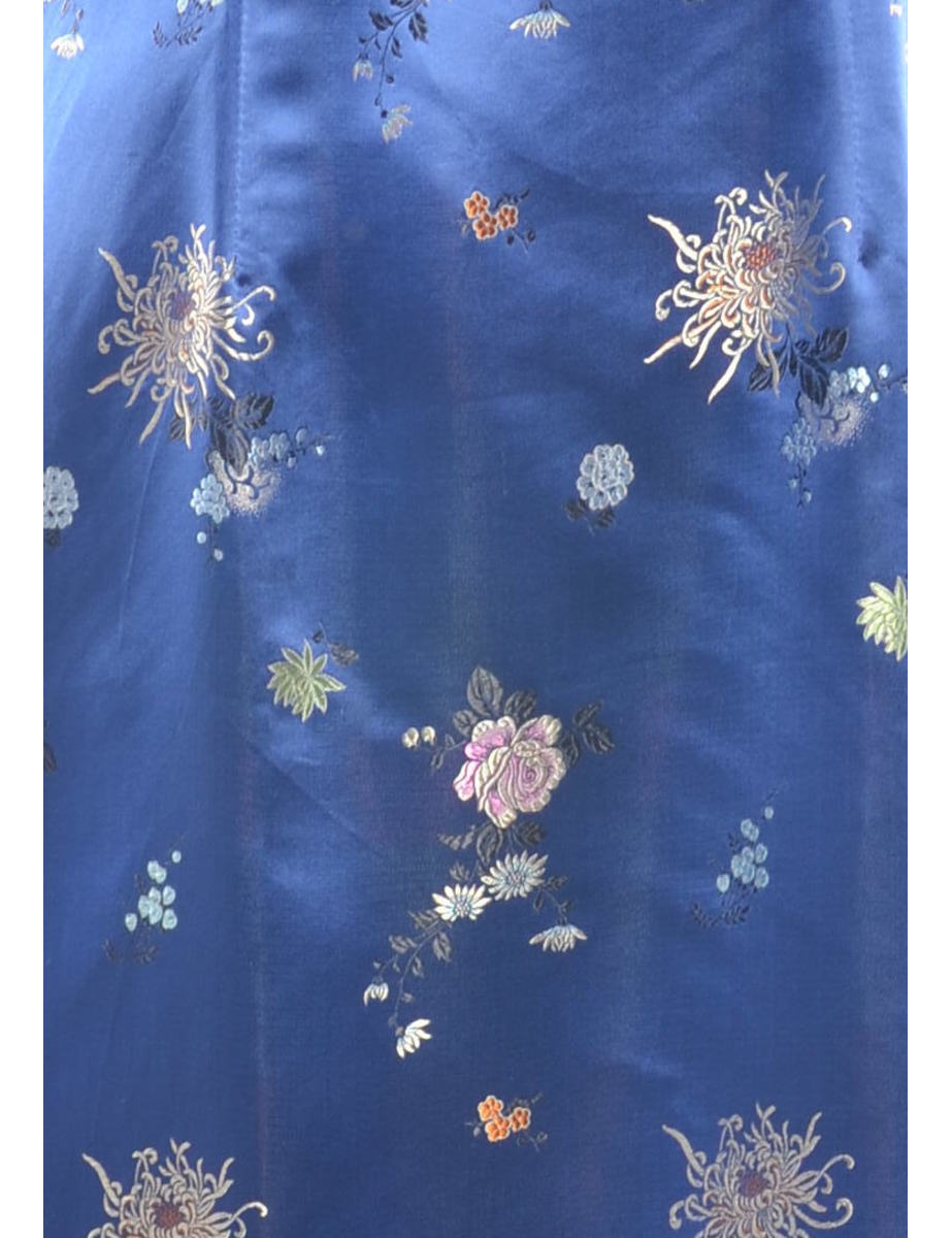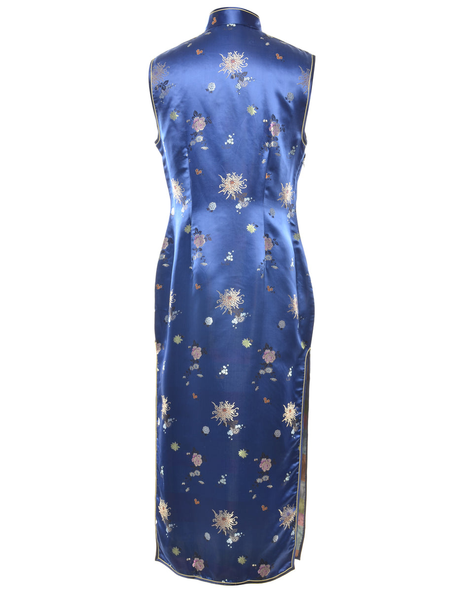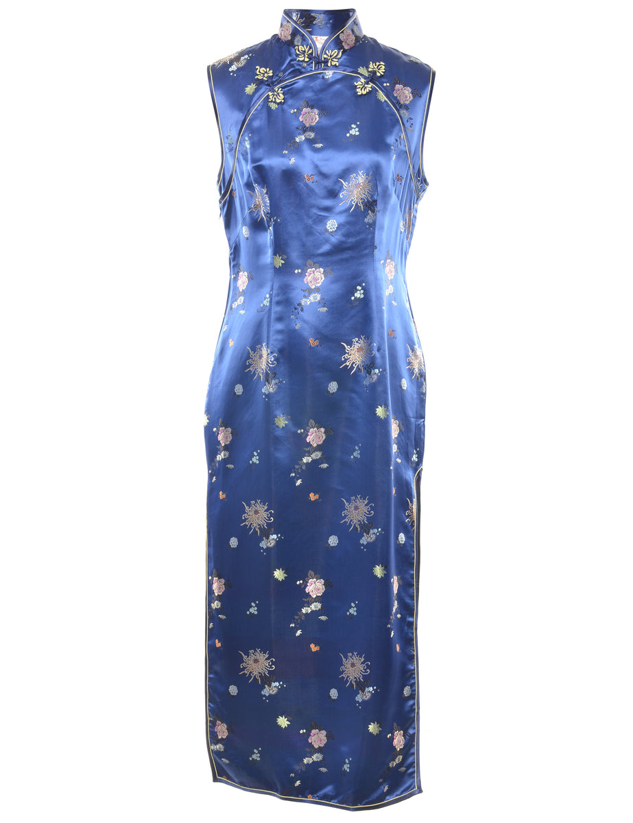 Brocade evening dress. Comes in navy with floral pattern, cheongsam collar and side slit.