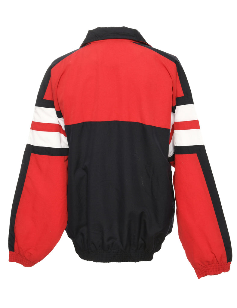 Zip front nylon sports jacket in navy, white & red with full lining and zippered pockets.