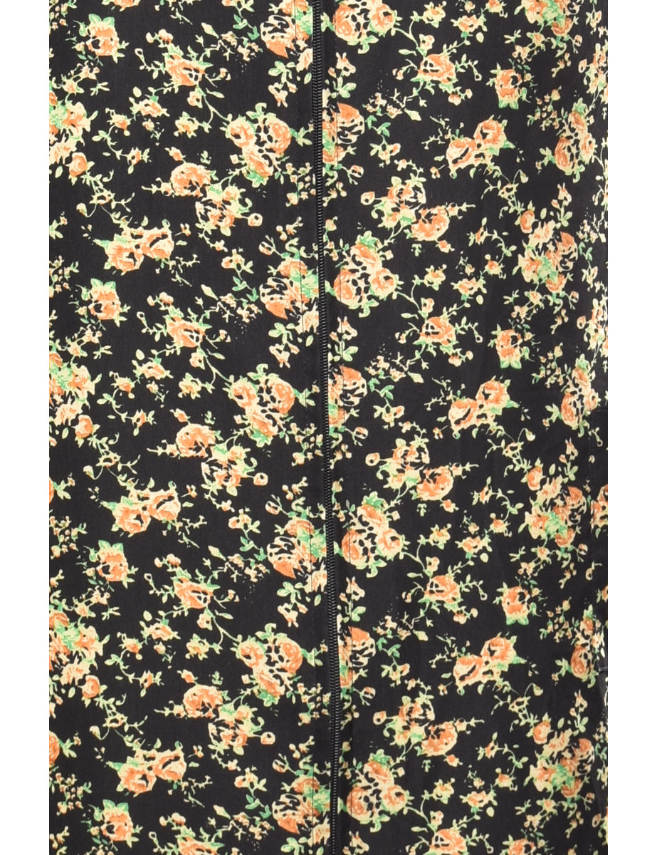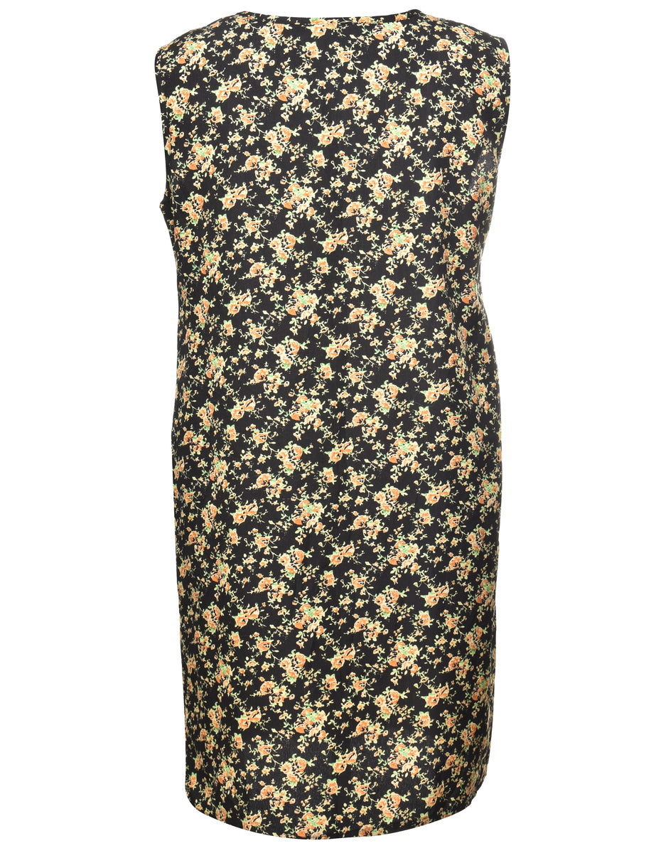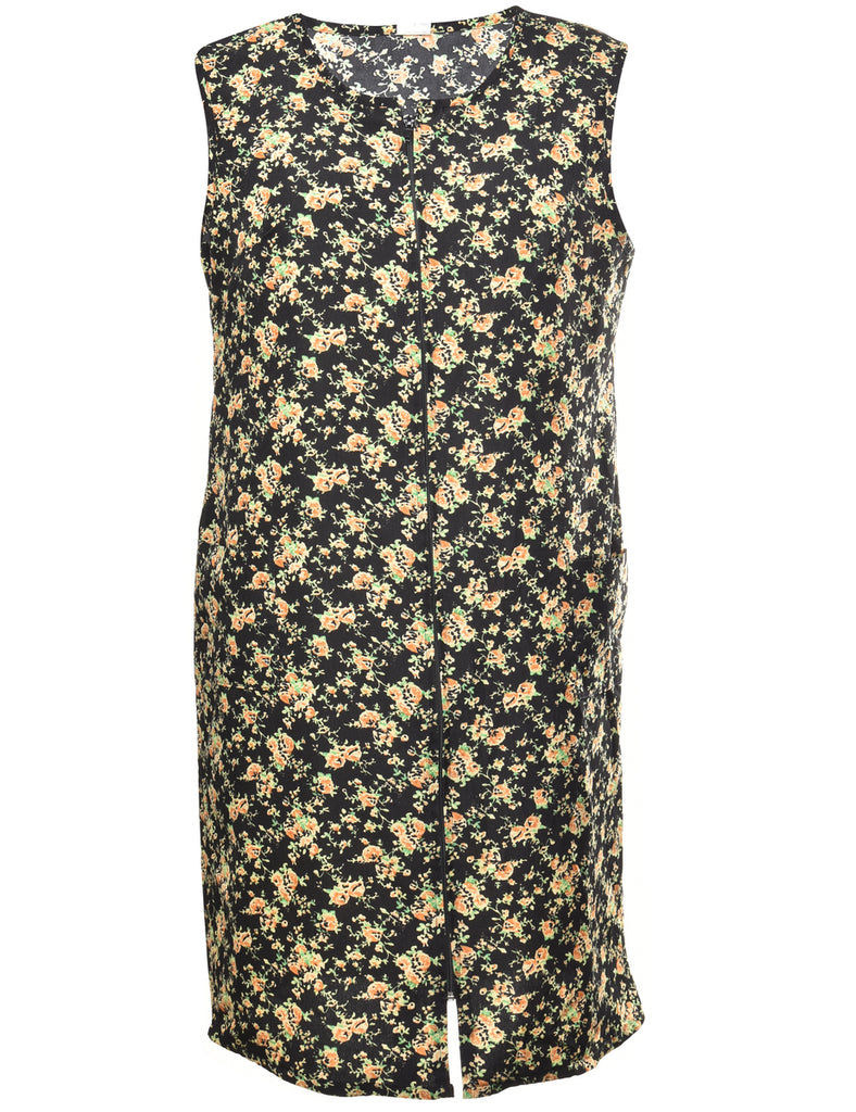 Sleeveless shift dress in black with ditzy floral print, a round neck.