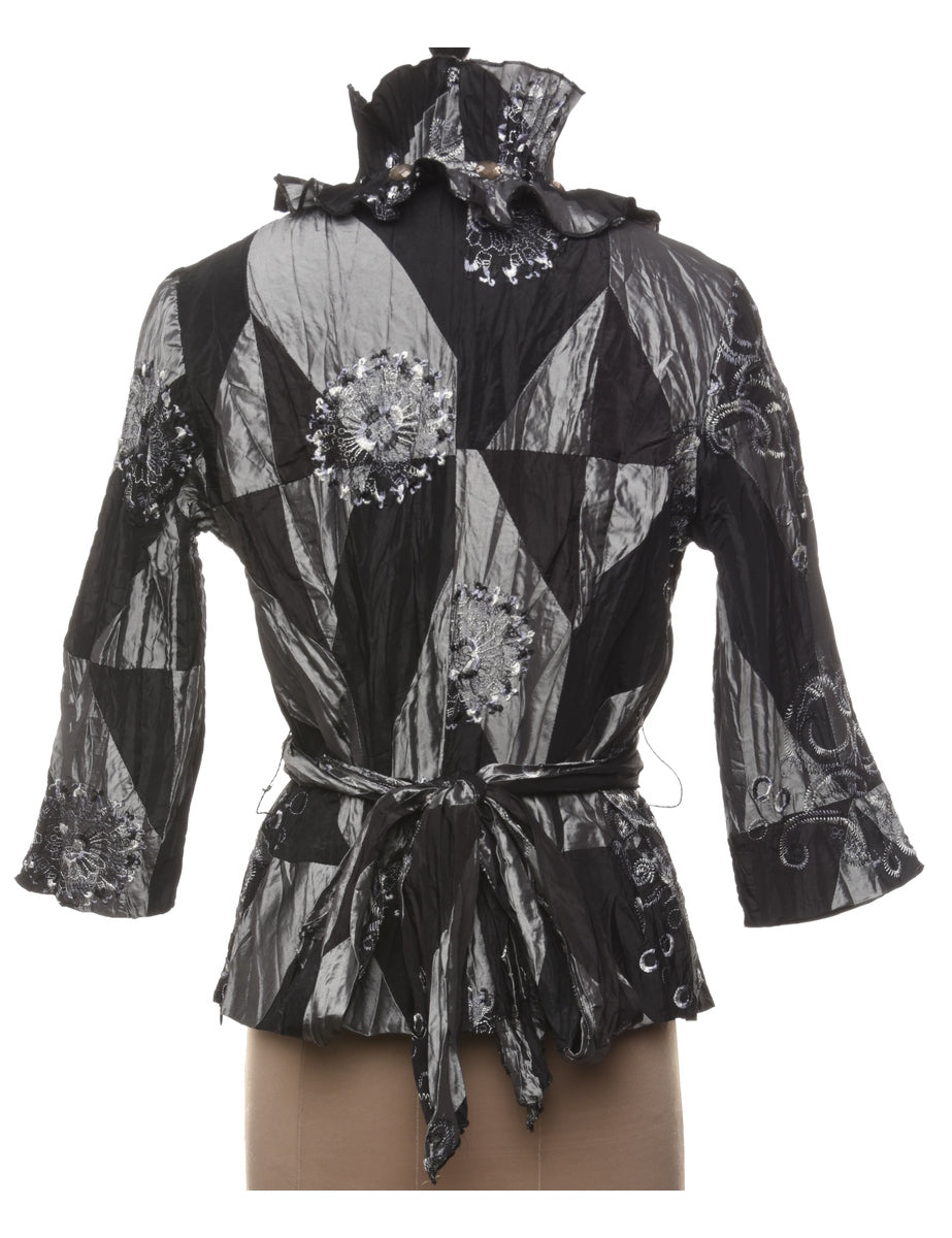 Embroidered black evening top with full lining and a belt.
