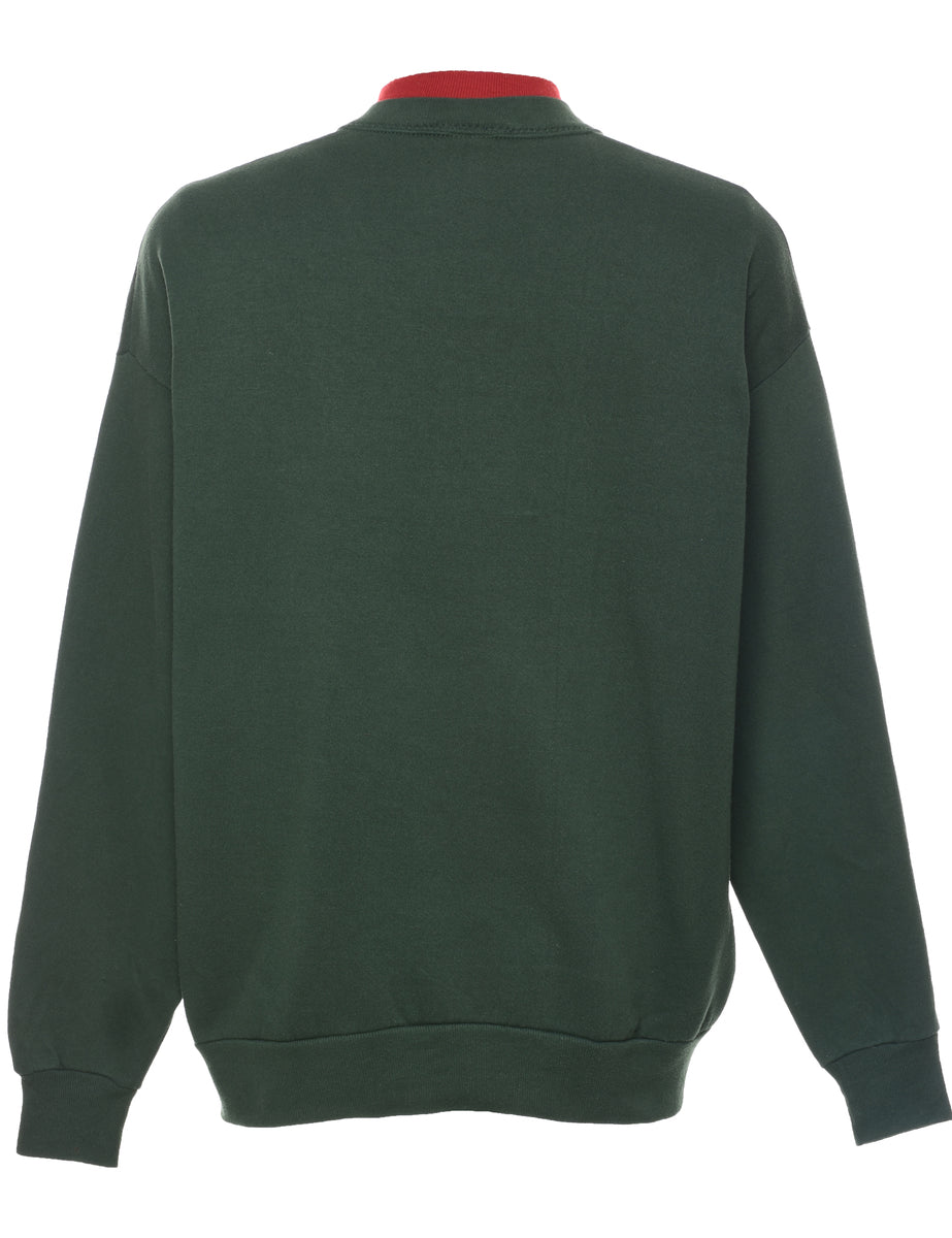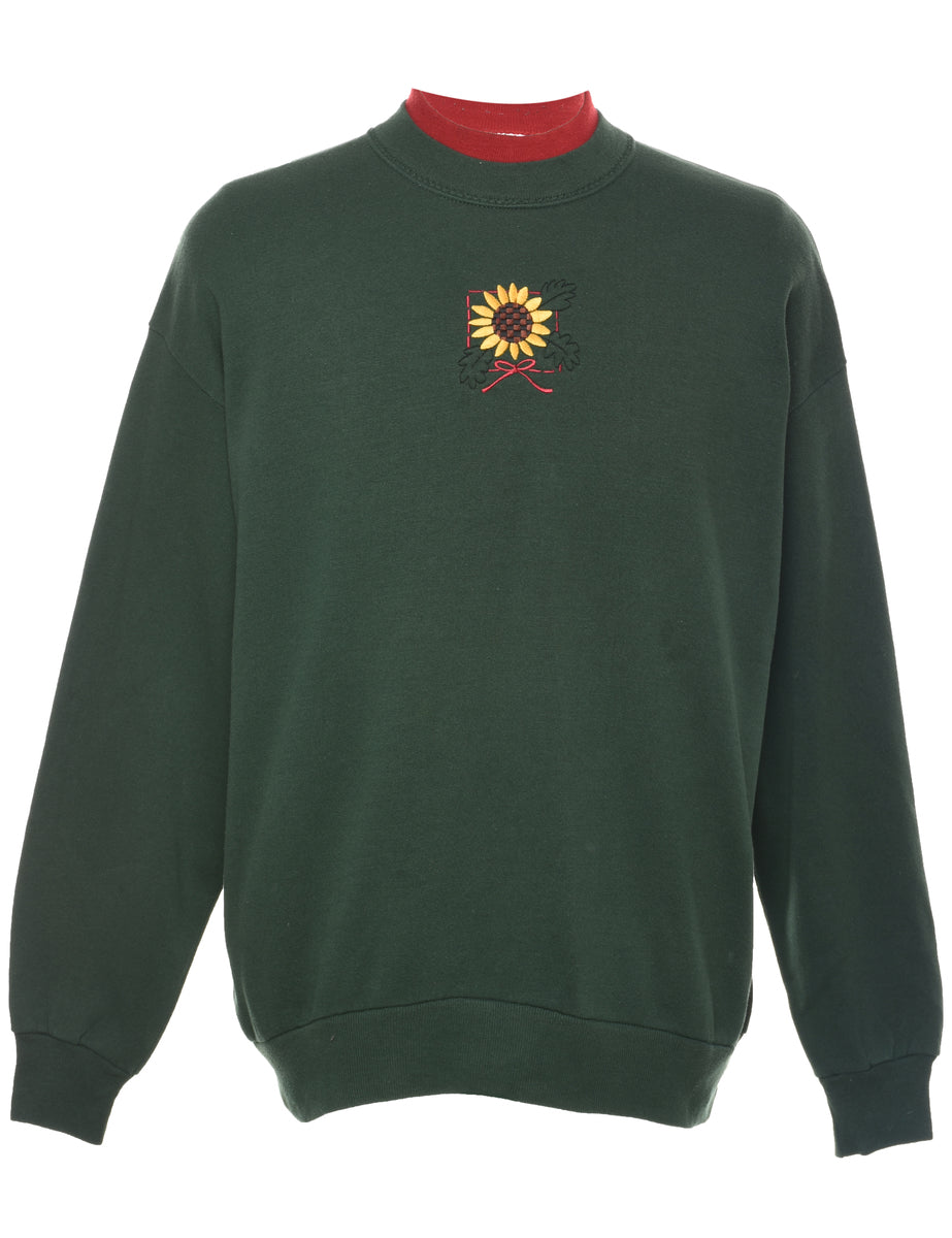 Floral embroidered sweatshirt comes in dark green with a high neck and a drop shoulder.