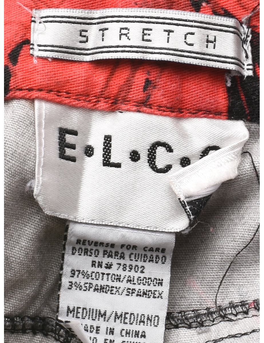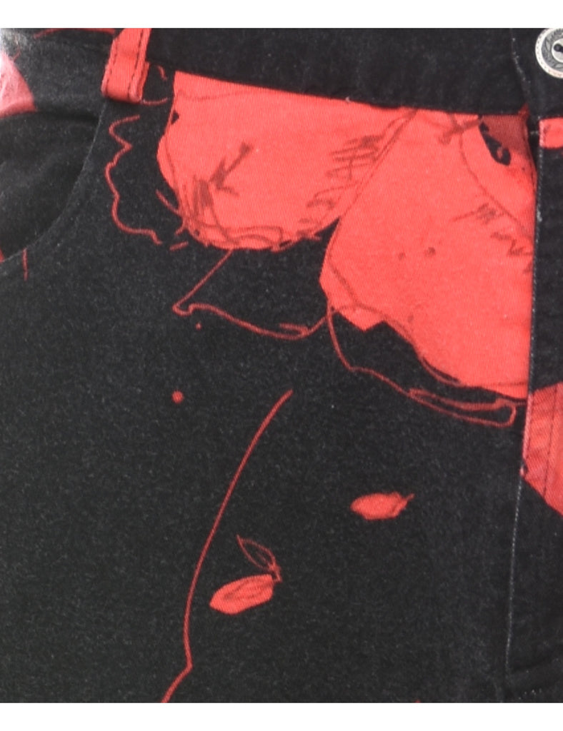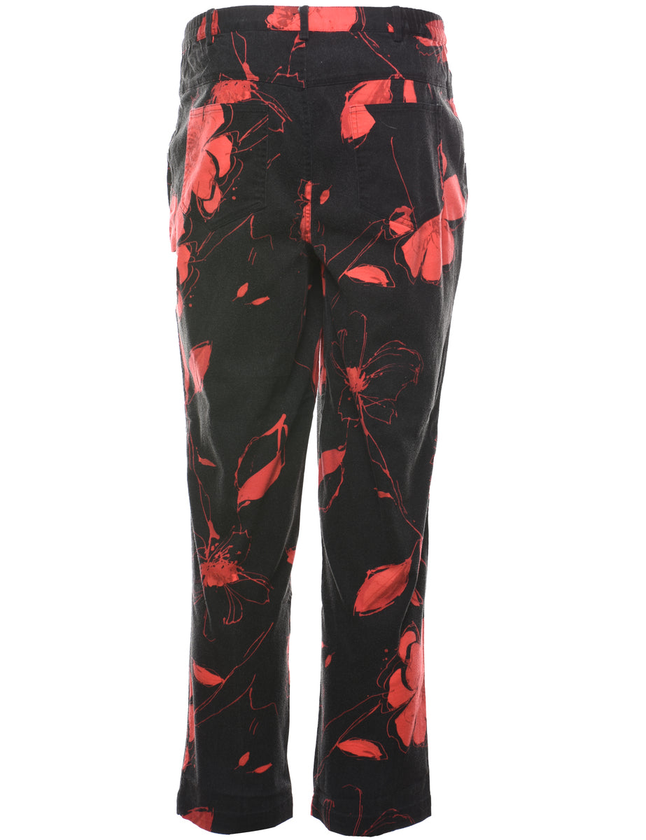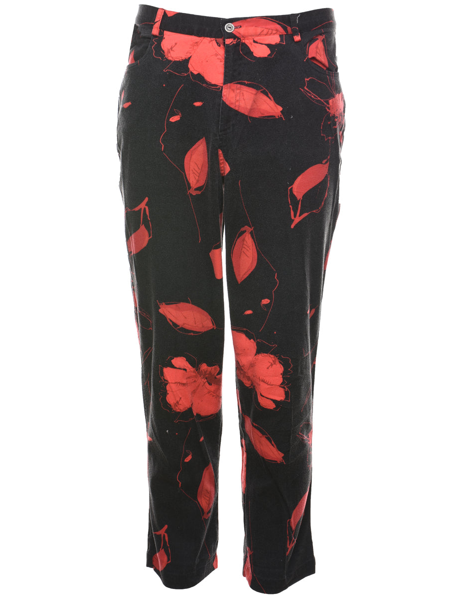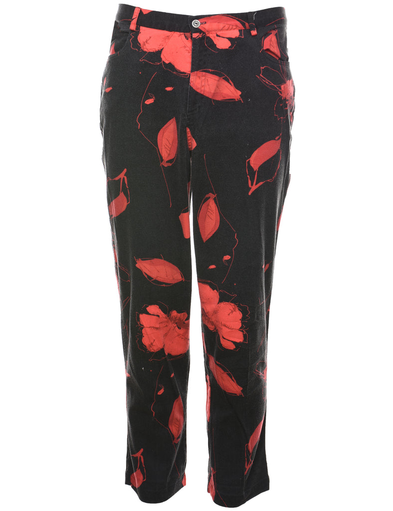 Black & red floral print trousers complete with belt loops and multiple pockets.