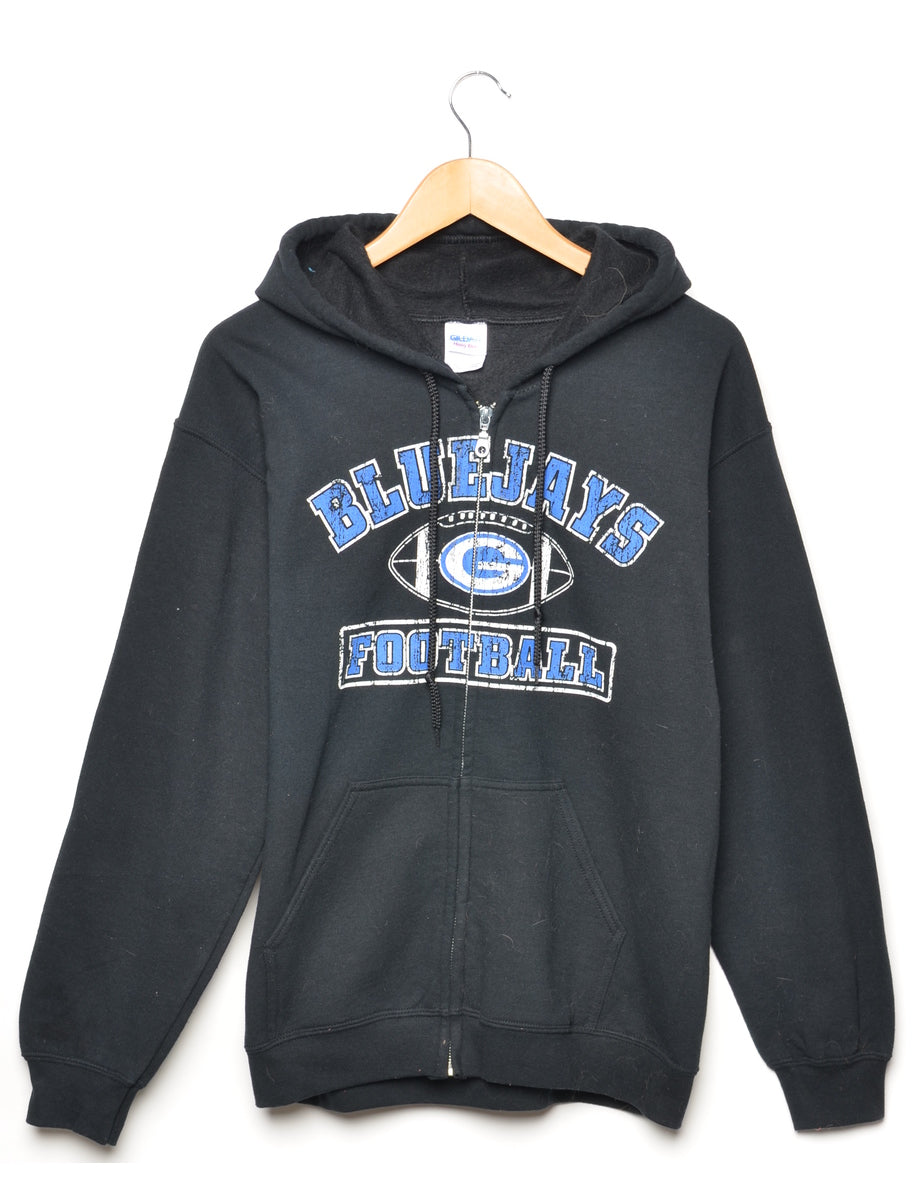 Gildan football bluejays printed hoodie in black with a drawstring neck and two pockets.