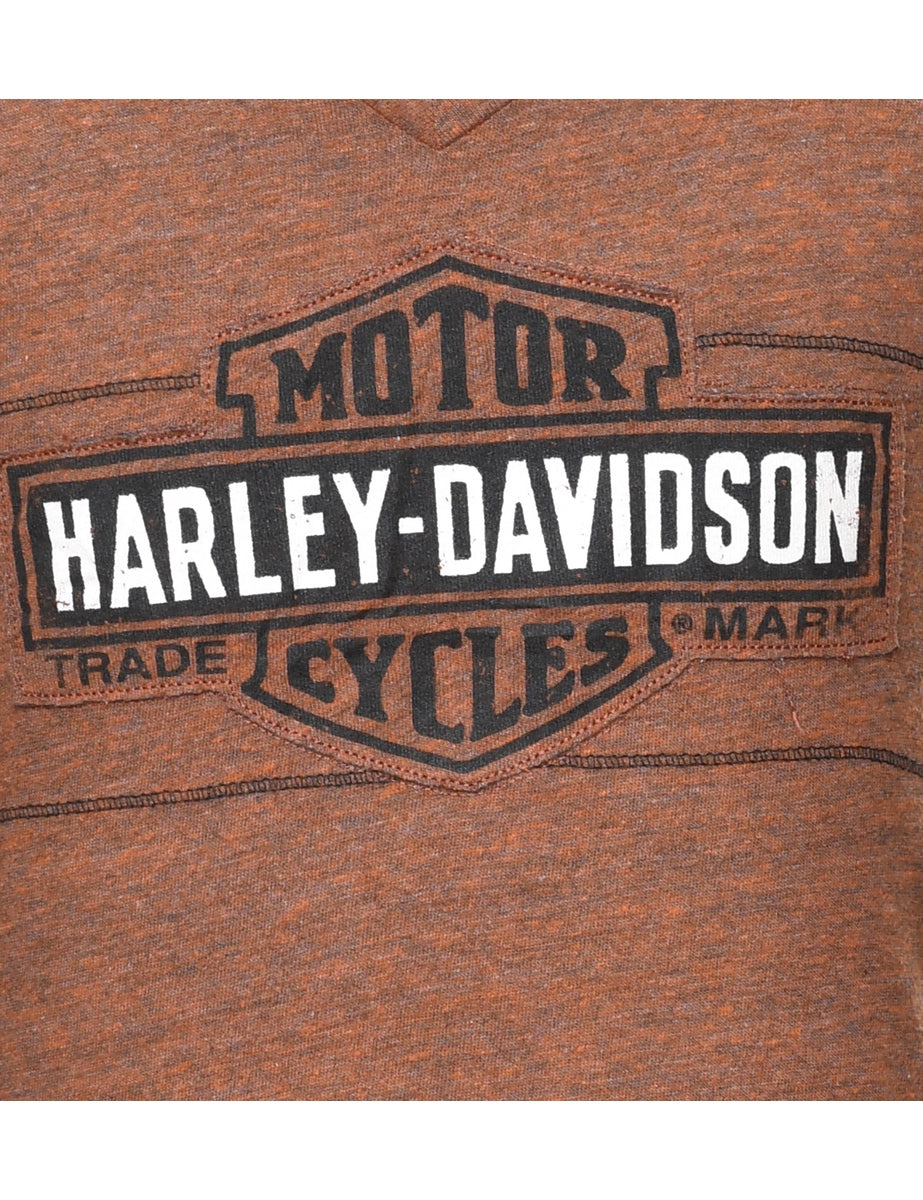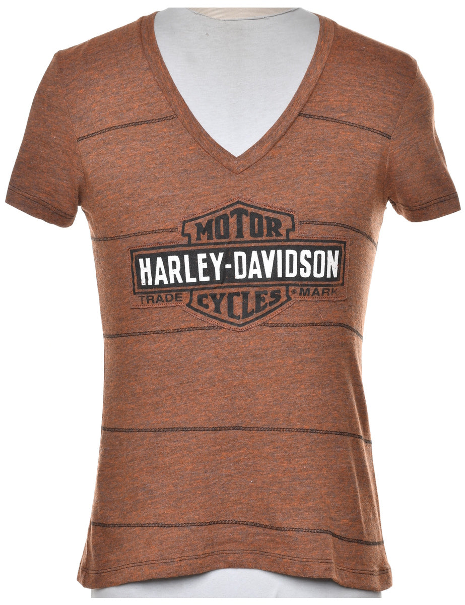 Harley Davidson striped printed t-shirt in brown with a v-neck.