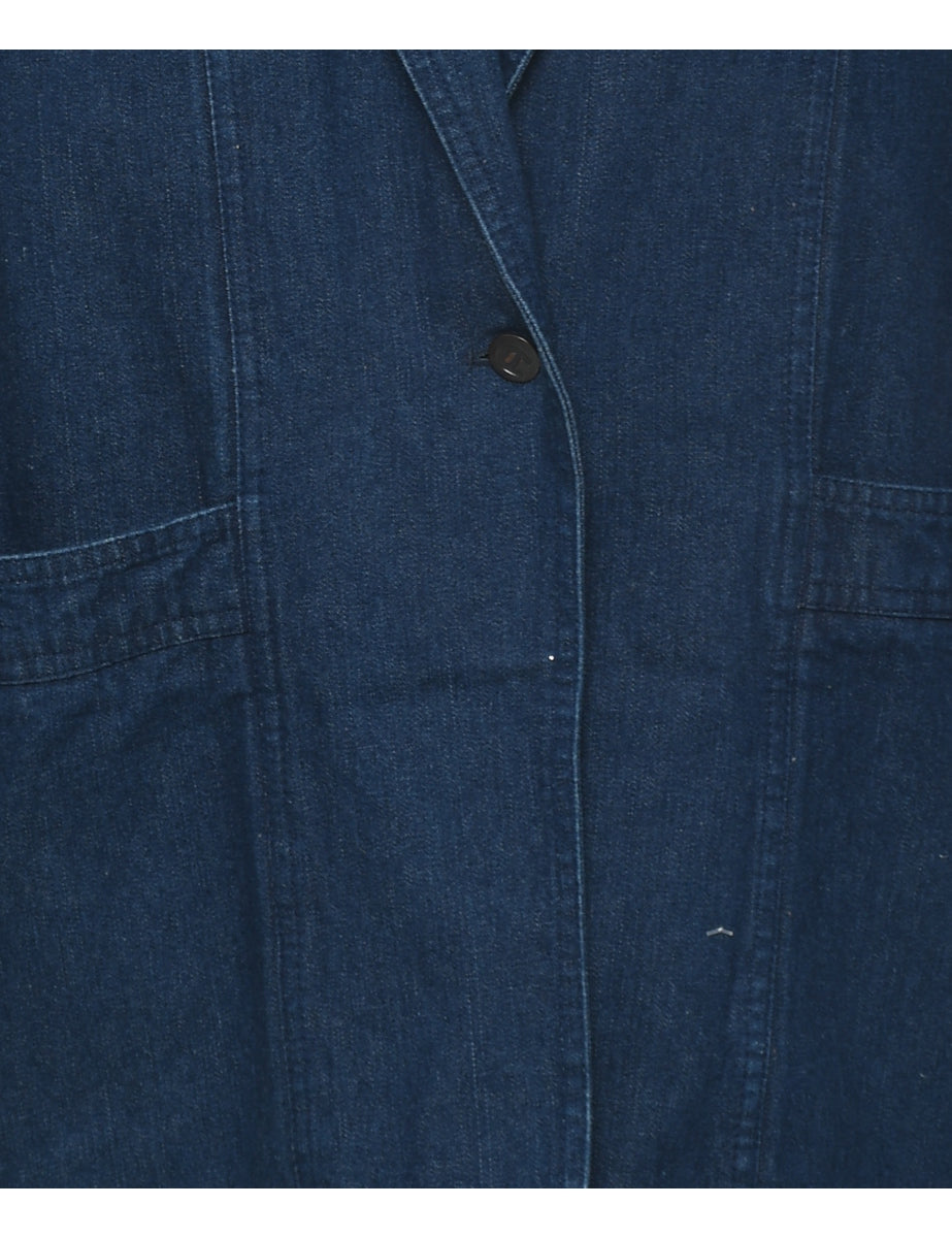 Button front denim jacket in indigo with multiple pockets and shoulder pads.