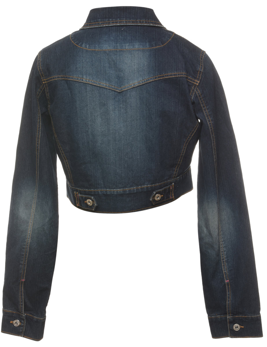 Button front denim jacket in indigo with pockets.