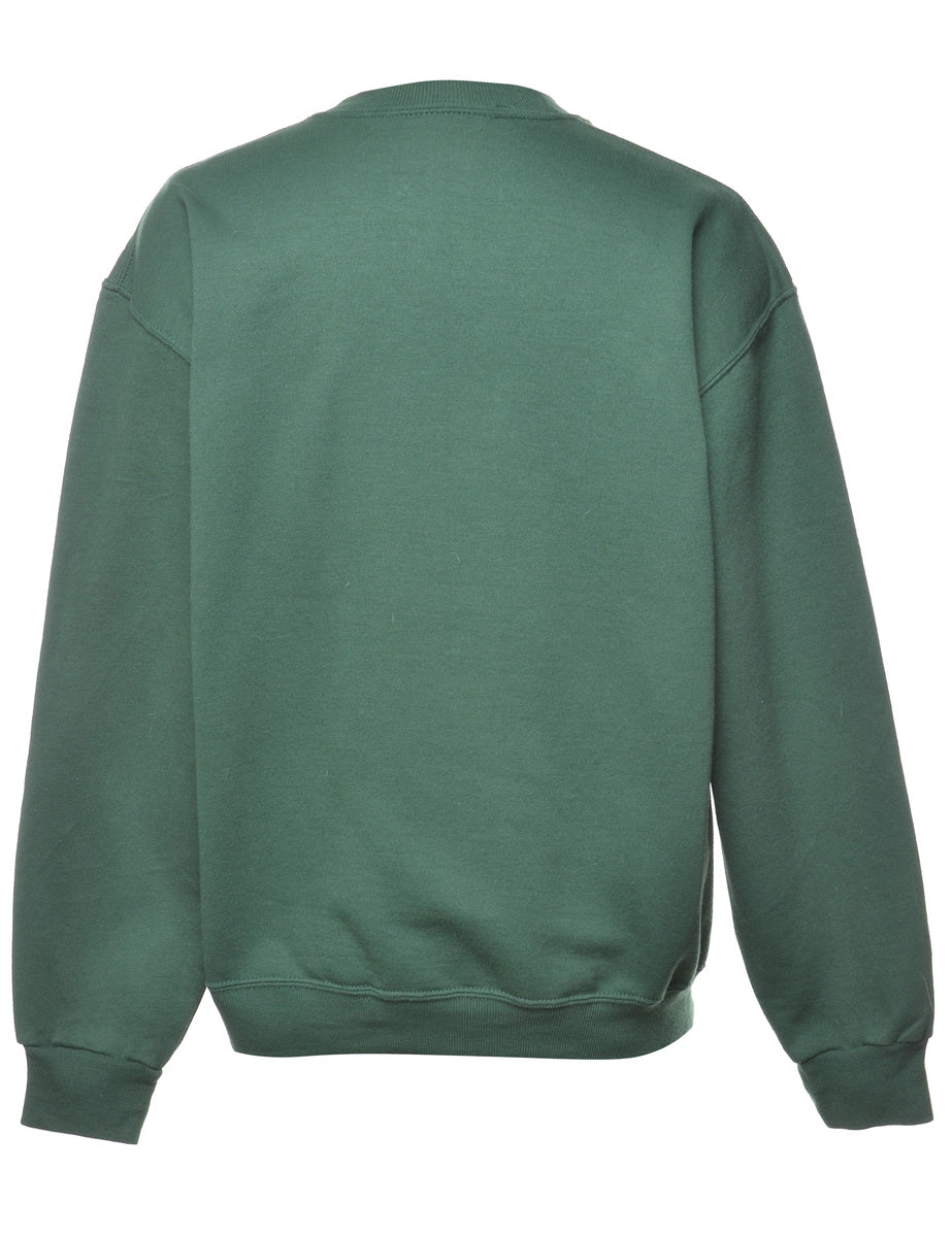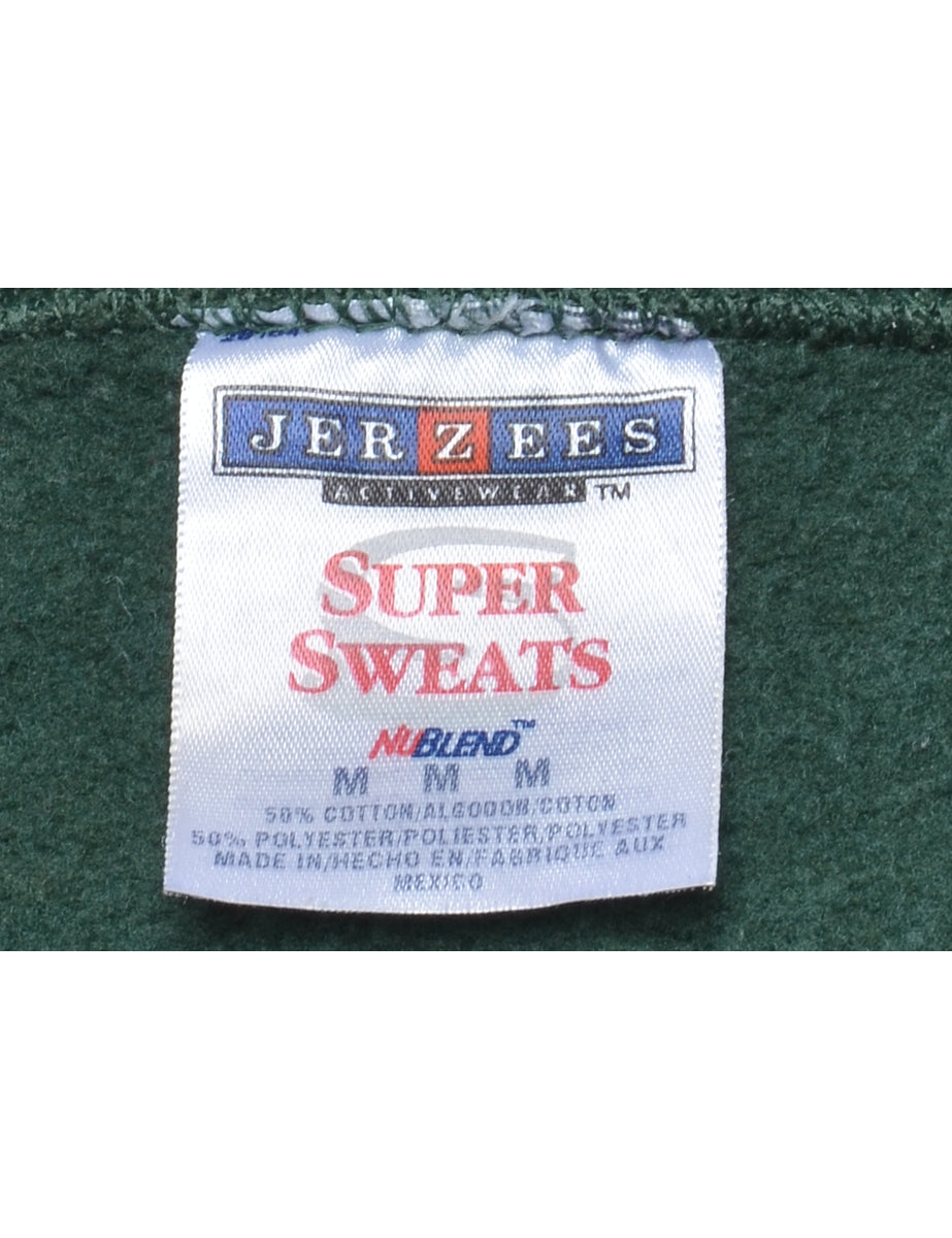 Jerzees printed sweatshirt comes in dark green with ribbed cuffs and waistband.
