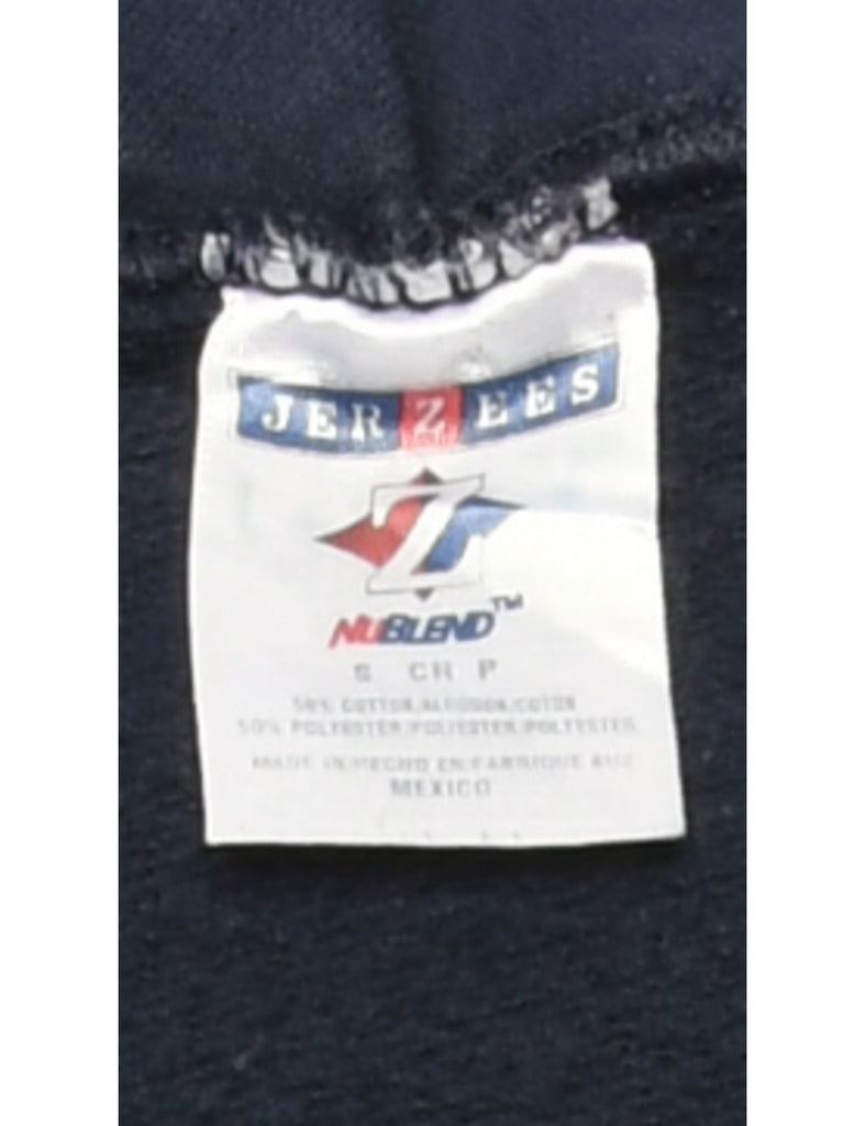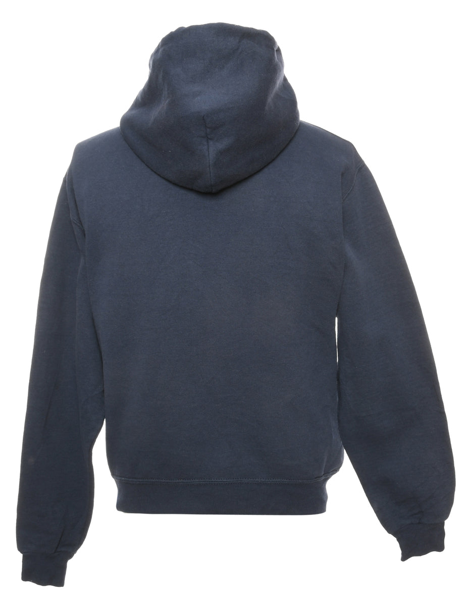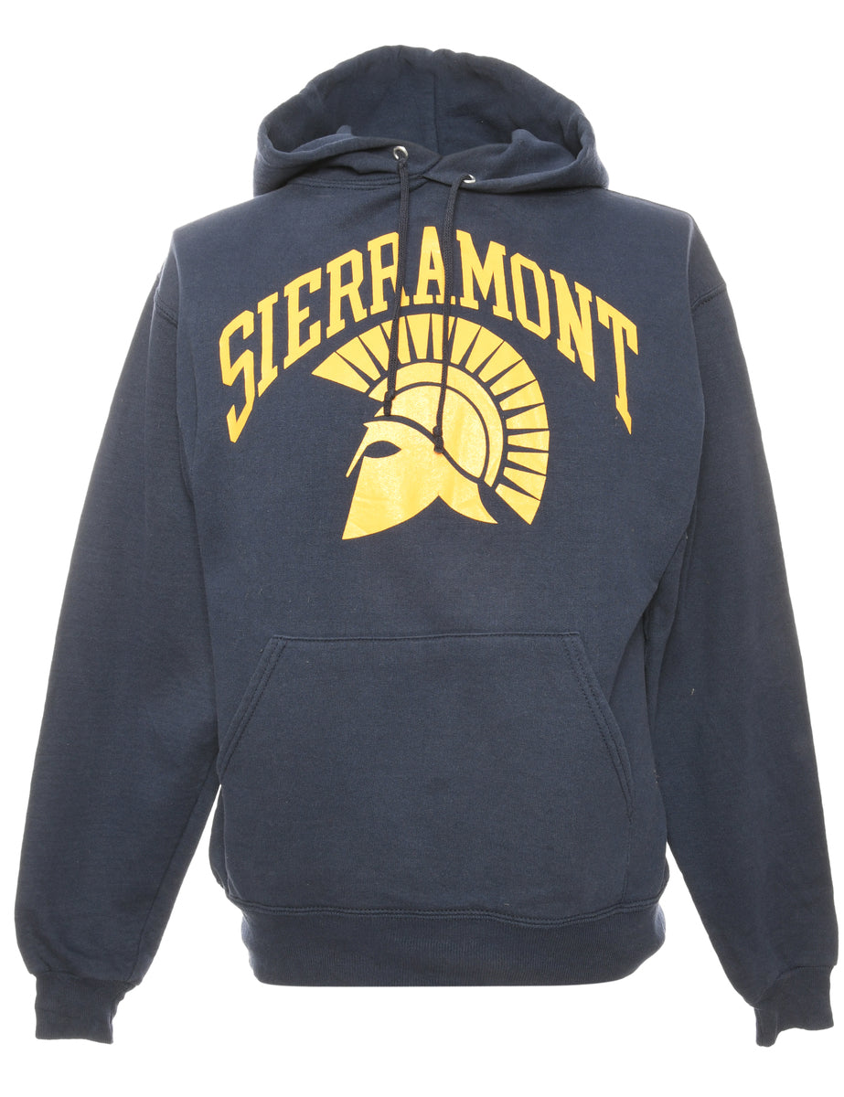 Jerzees sierramont printed hoodie comes in navy with a pocket.