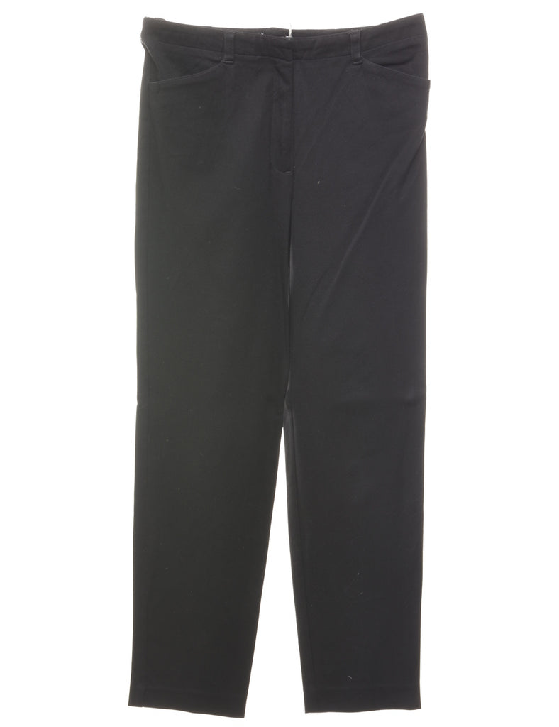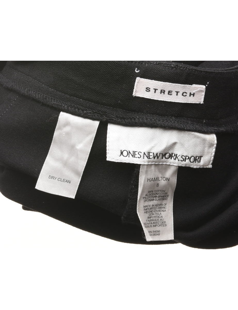 Jones New York straight leg trousers in black with belt loops and two pockets.