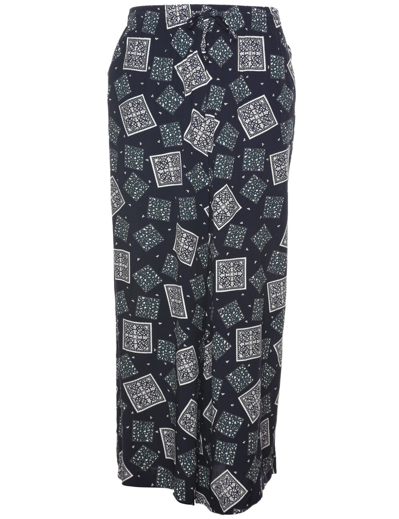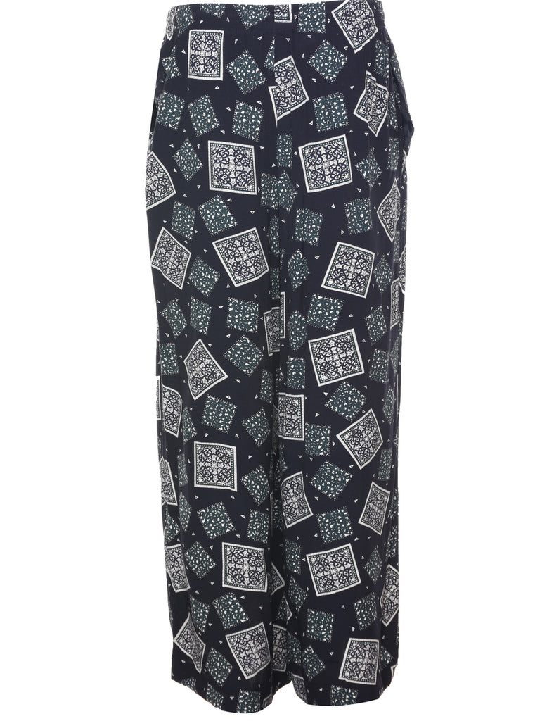 Printed trousers comes in black with multiple pockets and a drawstring waist.