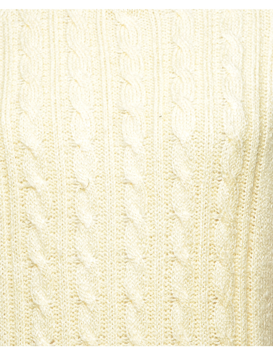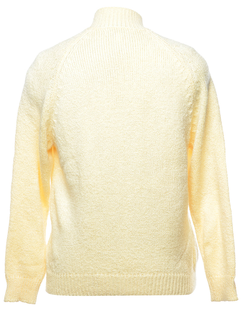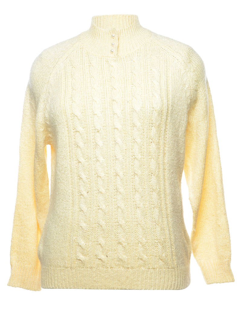 Cable knit jumper in pale yellow with a crew neck and raglan sleeves. The size label mentions XL but based on the actual measurements we consider it a size M.