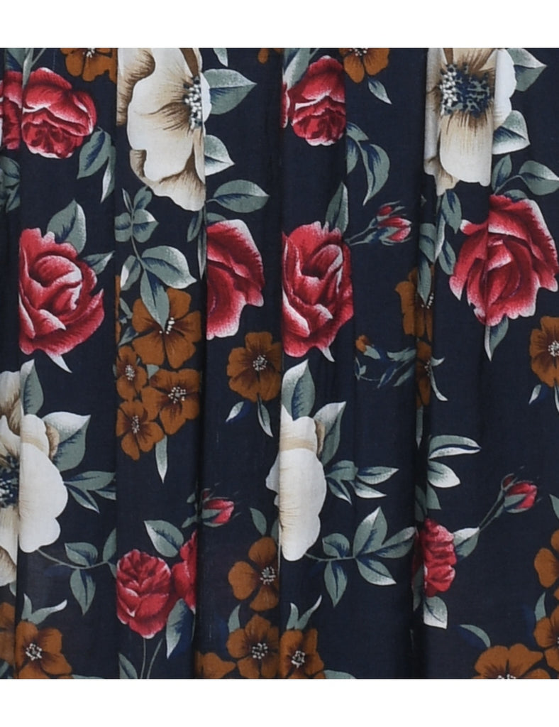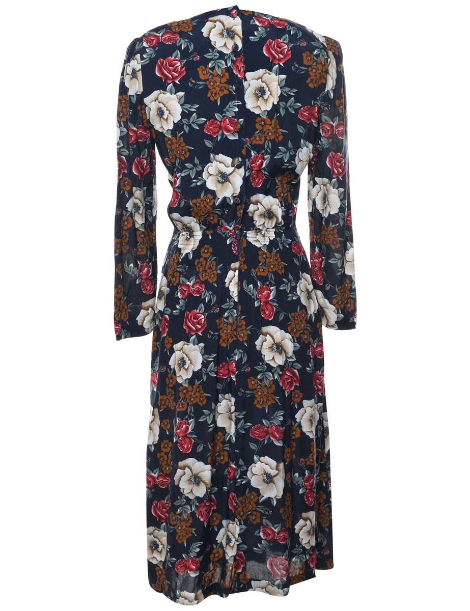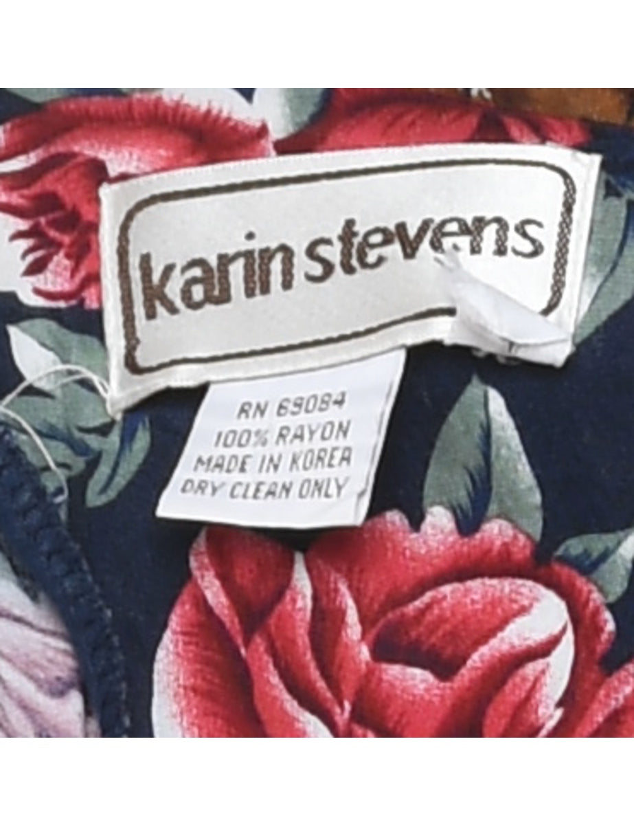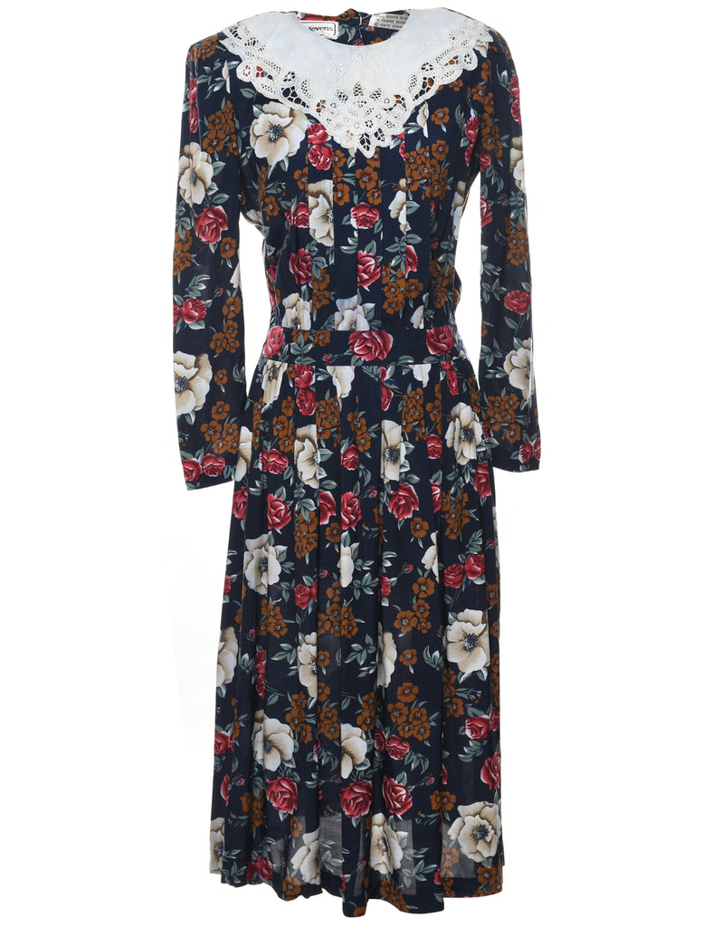 Floral print multi-colour Karin Stevens dress with contrasting collar and removable shoulder pads.