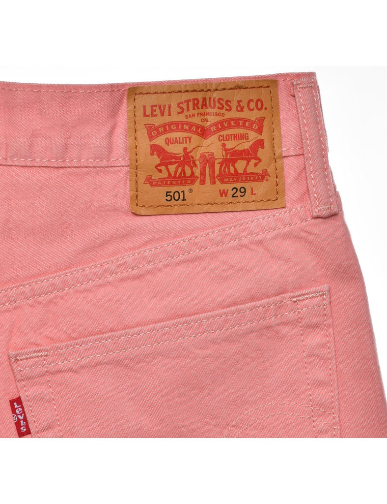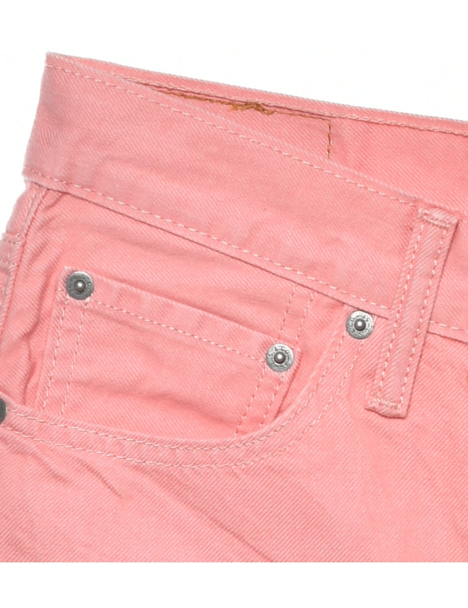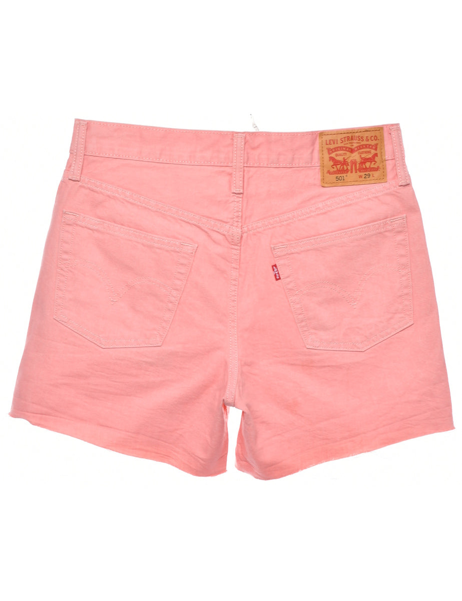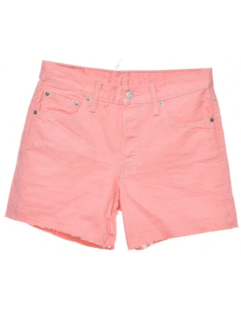 Levi's denim shorts in pastel peach with a frayed hem and belt loops.