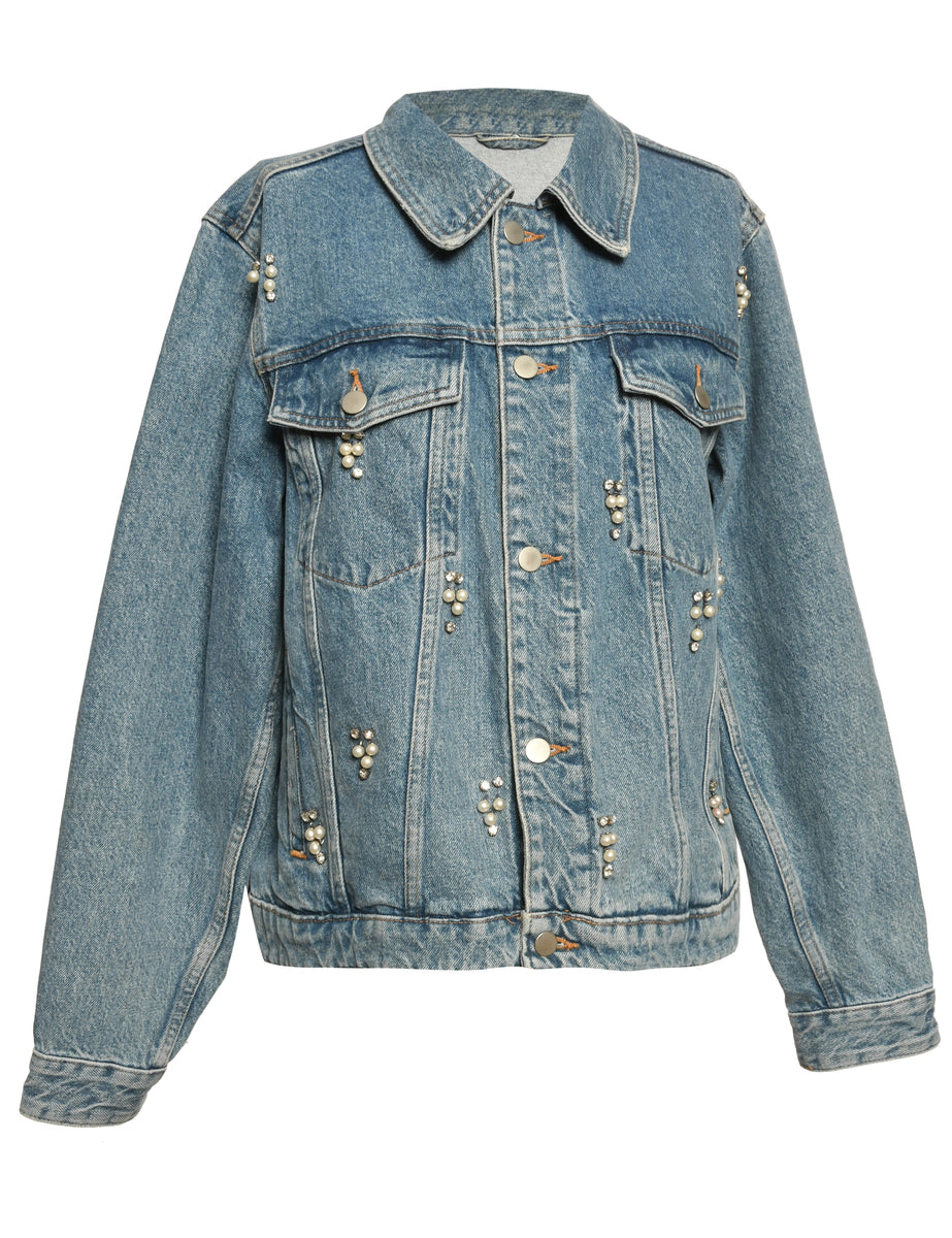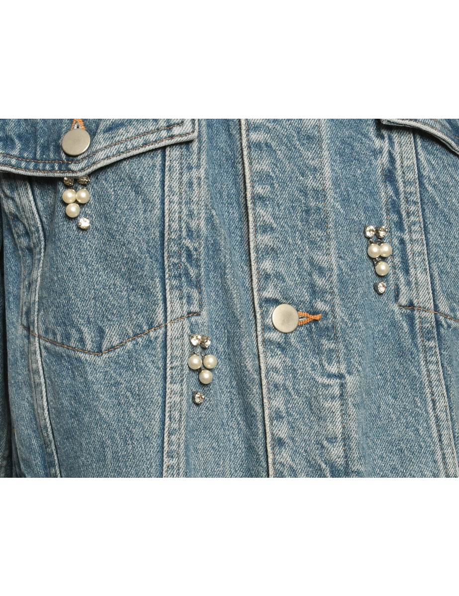 Vintage Light Wash Beaded Pearl Denim Jacket - M