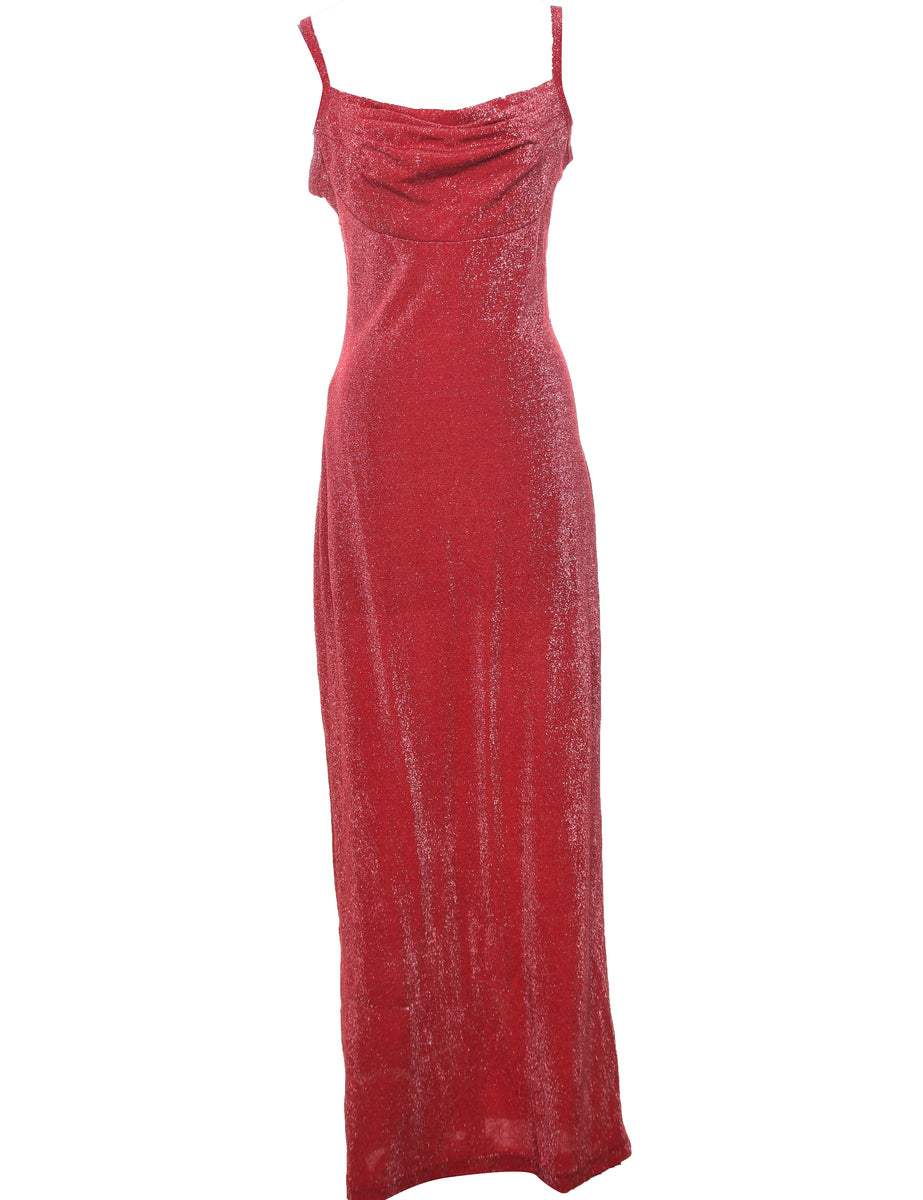 Lurex thread pattern sparkly red evening dress complete with a cowl neck and slit.