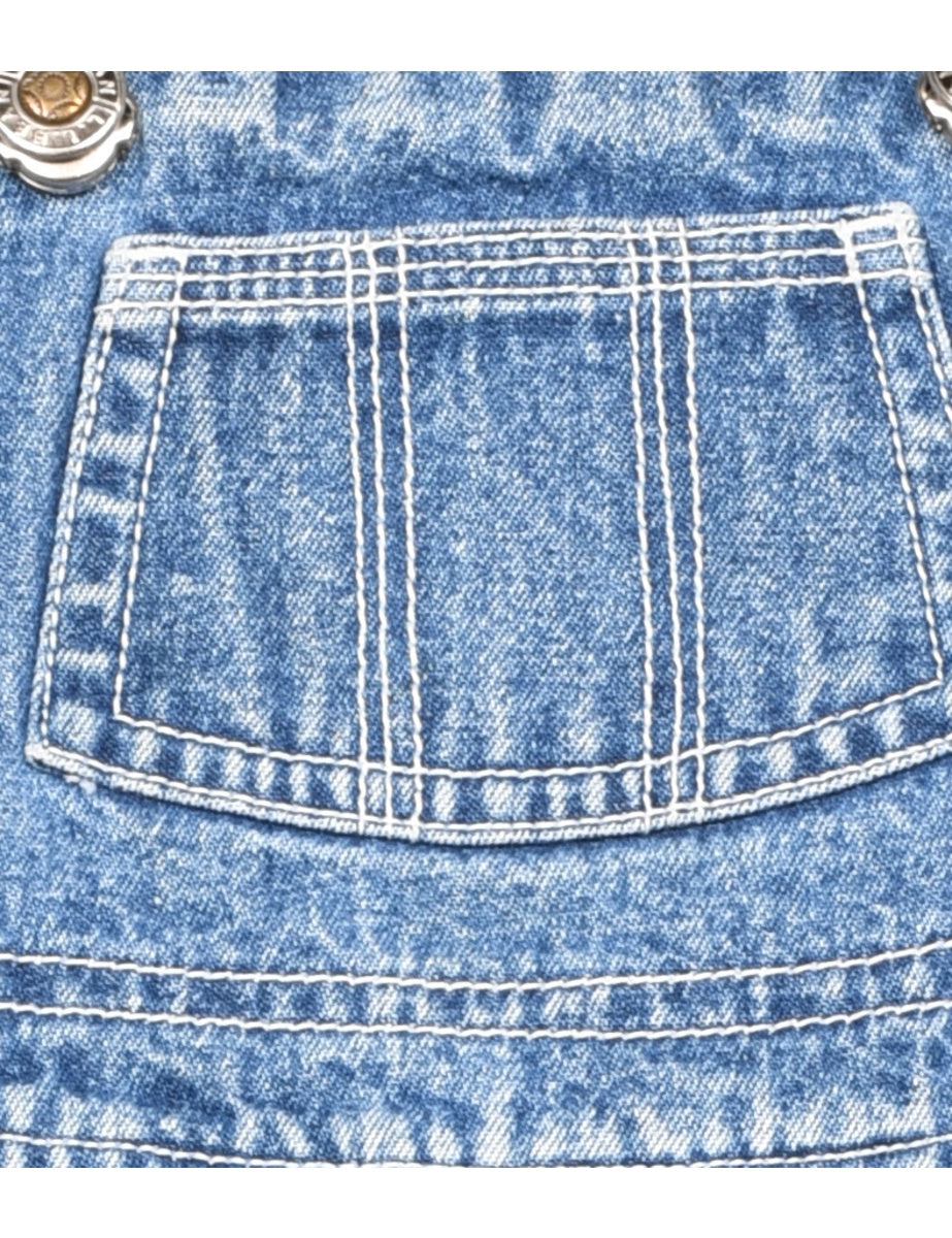 Denim medium wash short dungarees complete with adjustable straps and multiple pockets.