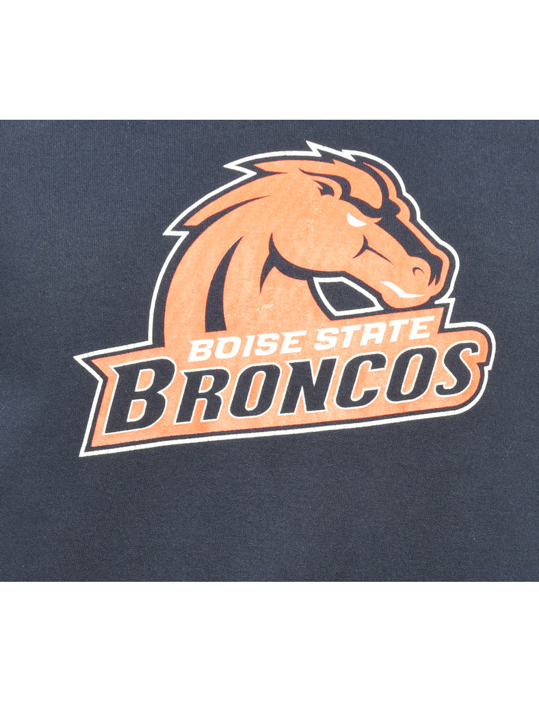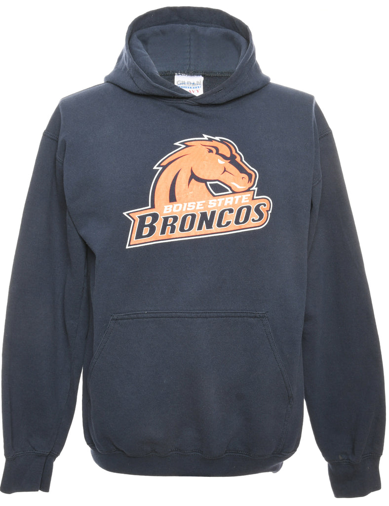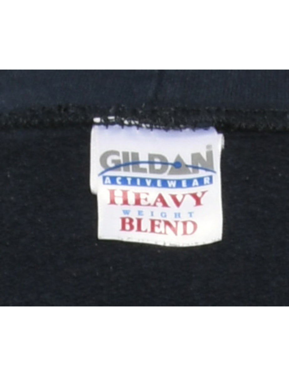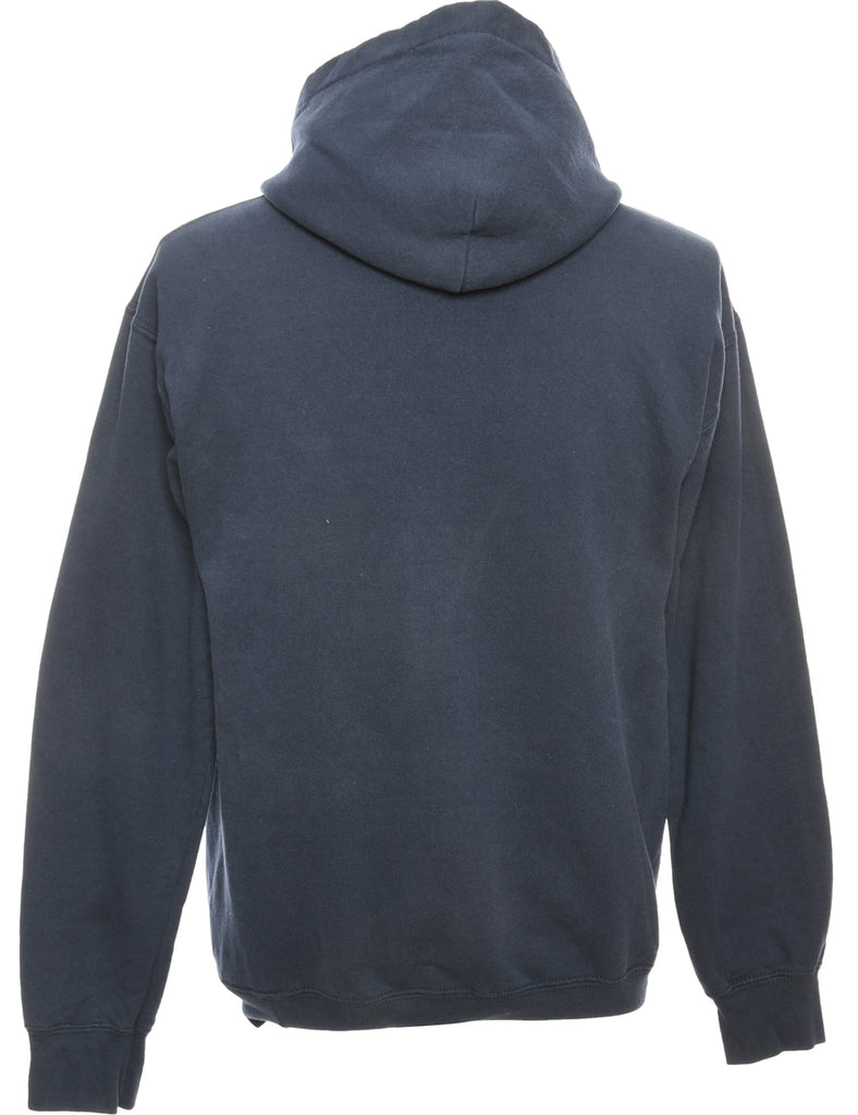 Gildan printed hoodie comes in navy with a pocket. Stain on front but otherwise in good condition.