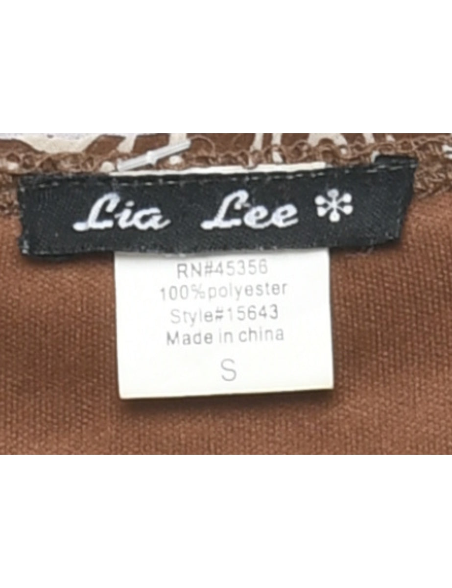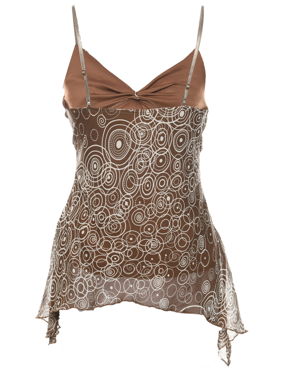Patterned printed top in brown with a handkerchief hem and adjustable straps.