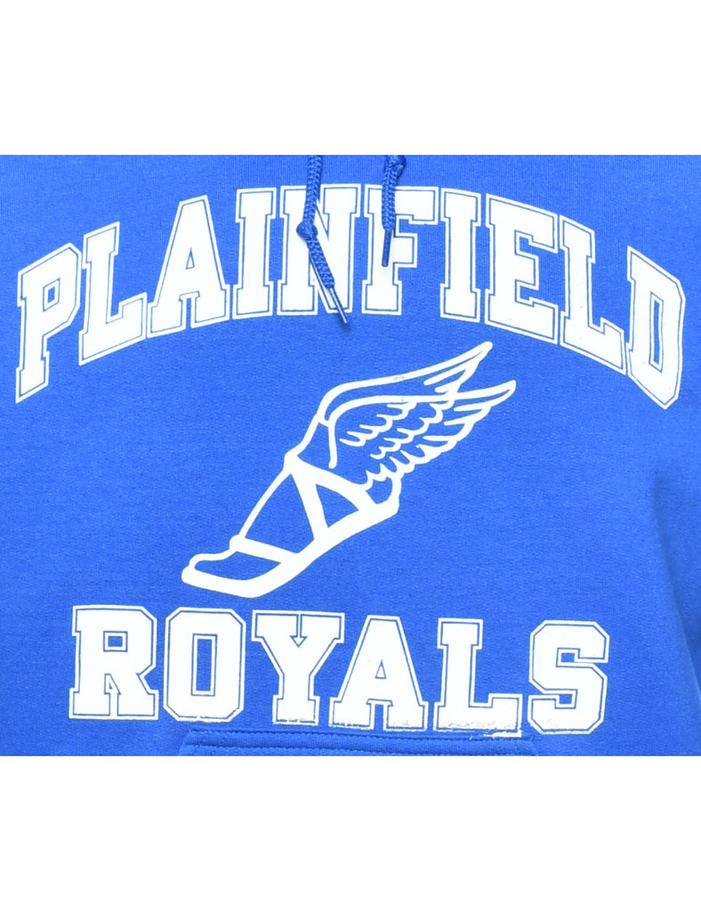 Petites gildan plainfield royals printed hoodie in blue with a drawstring neck and one pocket.