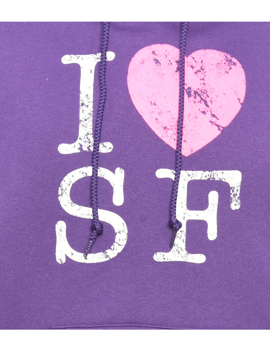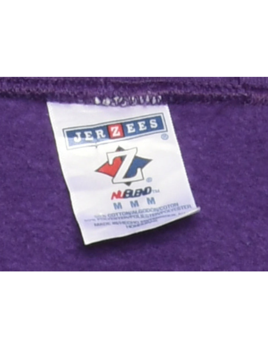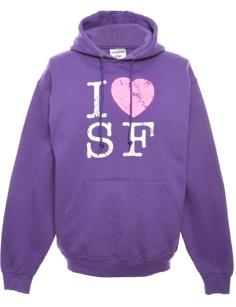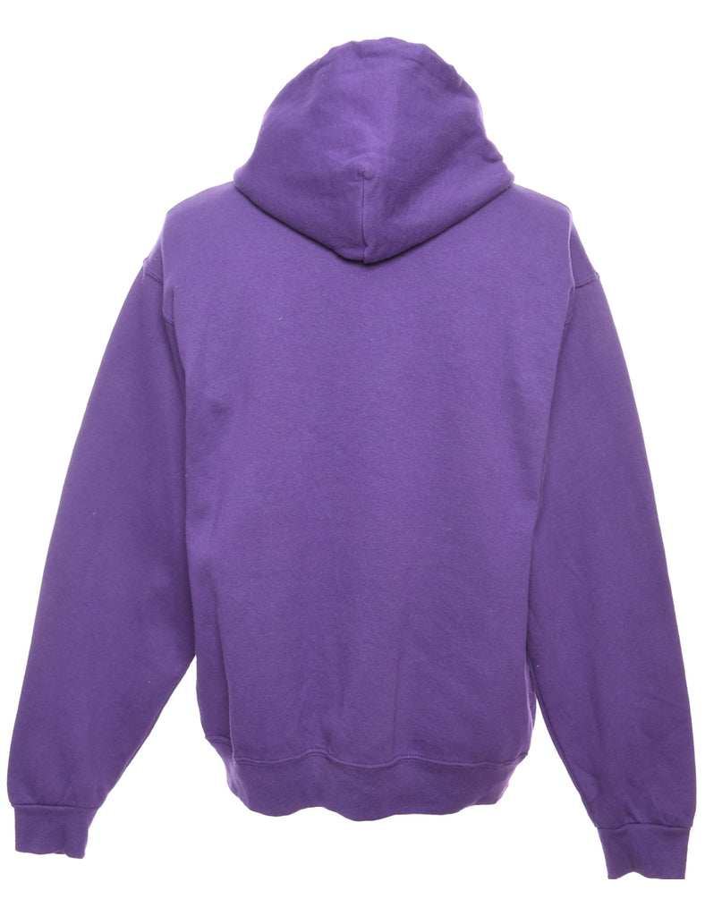Printed hoodie comes in purple with a pocket from the brand Jerzees.