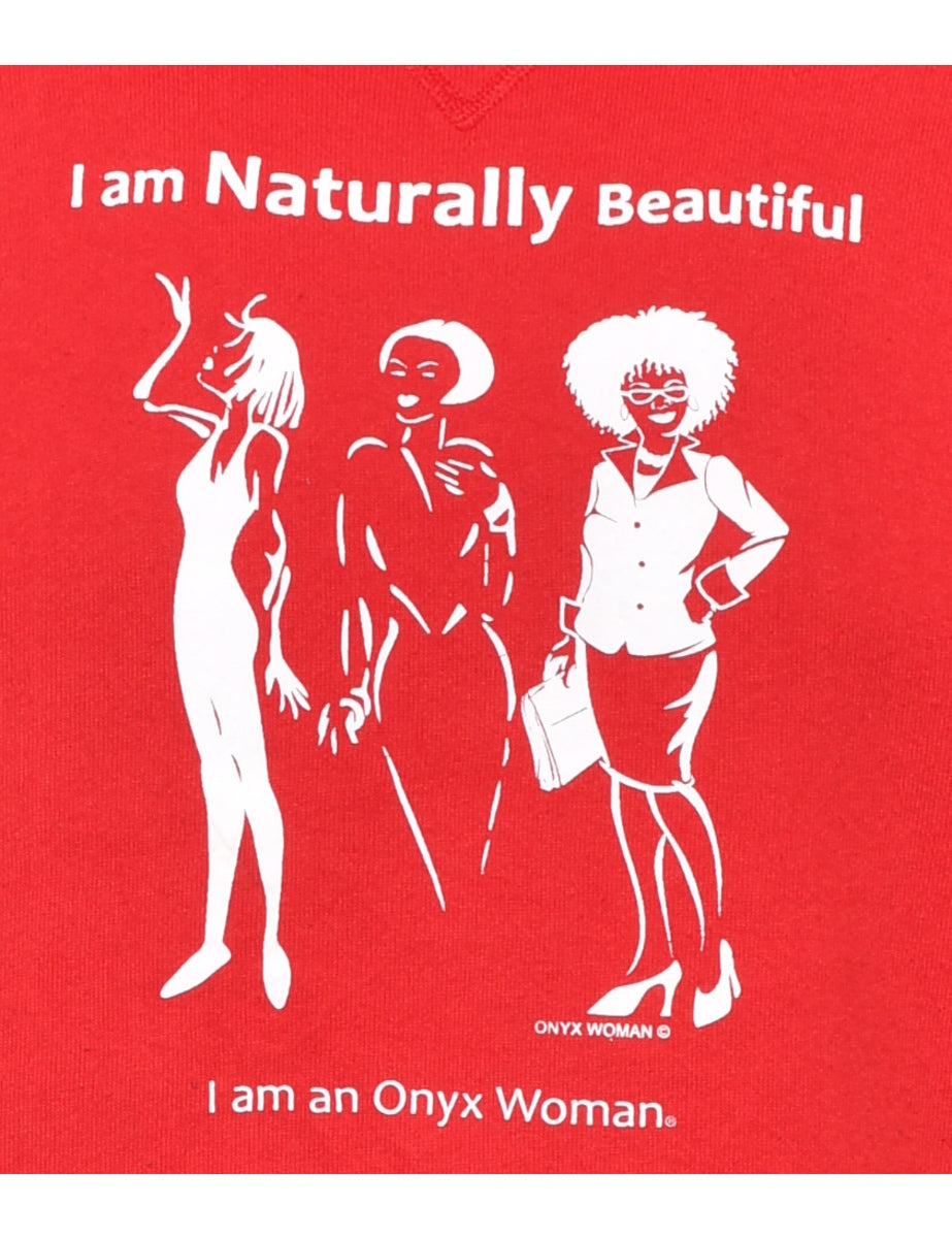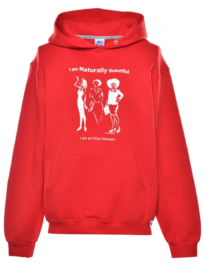 I am naturally beautiful I am an onyx woman printed sweatshirt in red with a hood and one pocket. From the brand Russell Athletic.