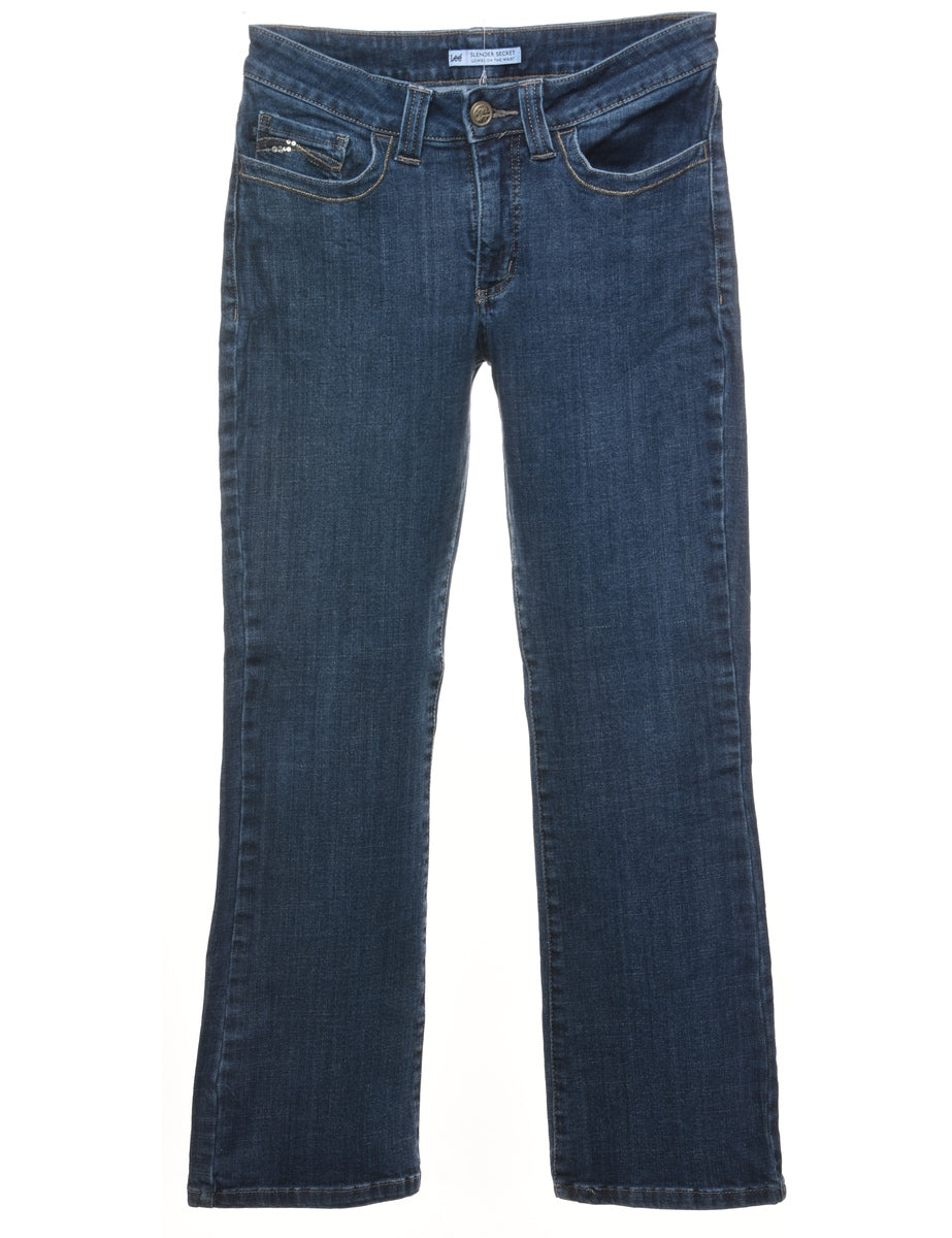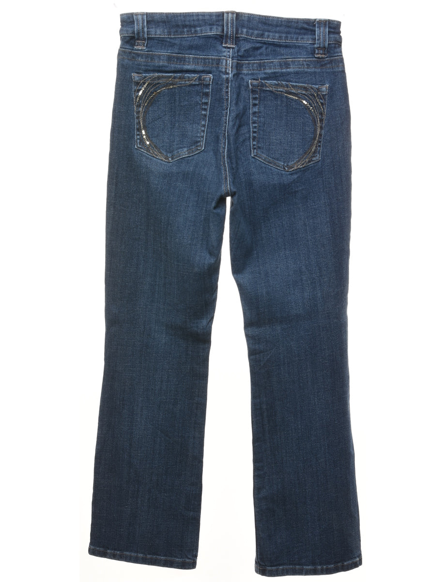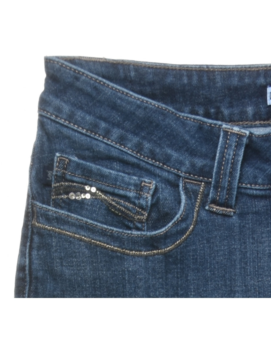 Straight leg lee jeans in dark wash with belt loops and sequins.