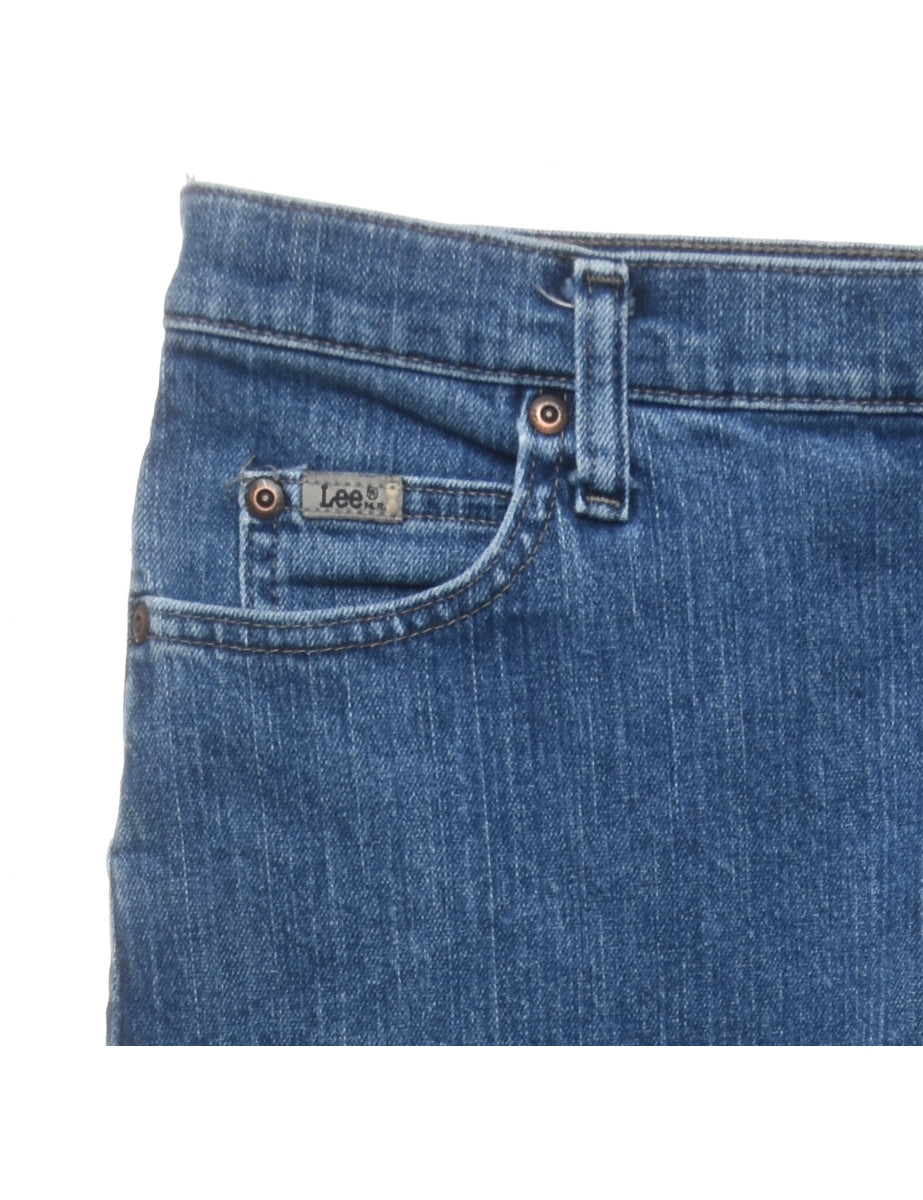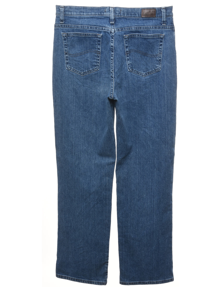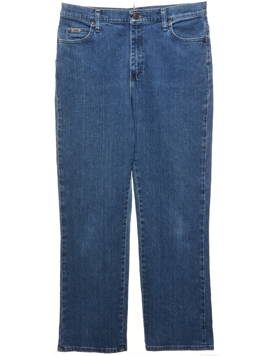 Straight leg lee jeans. Comes in medium wash with belt loops.