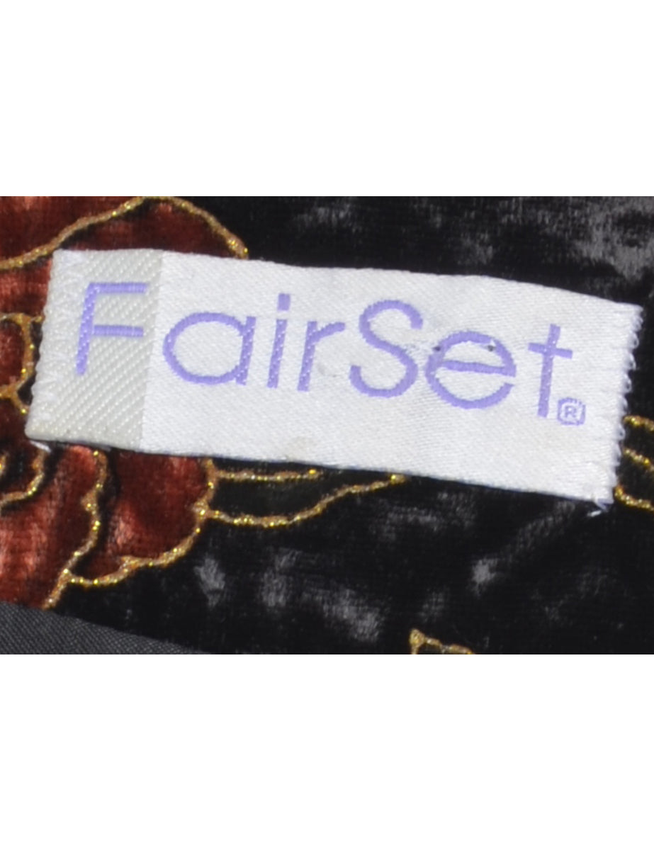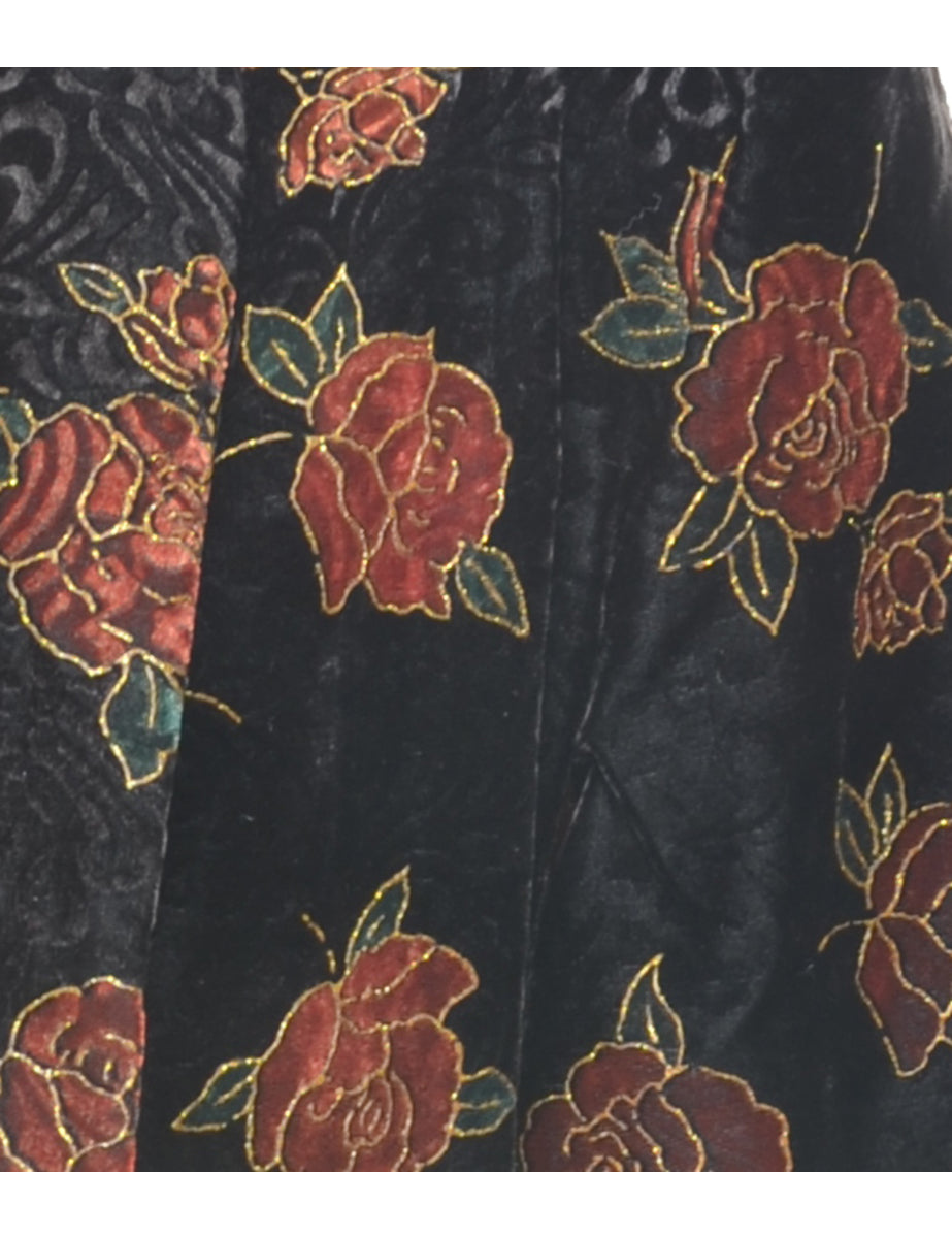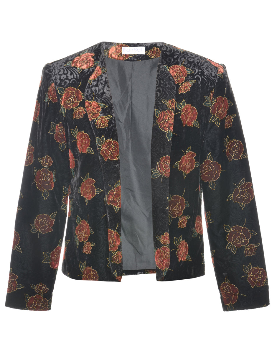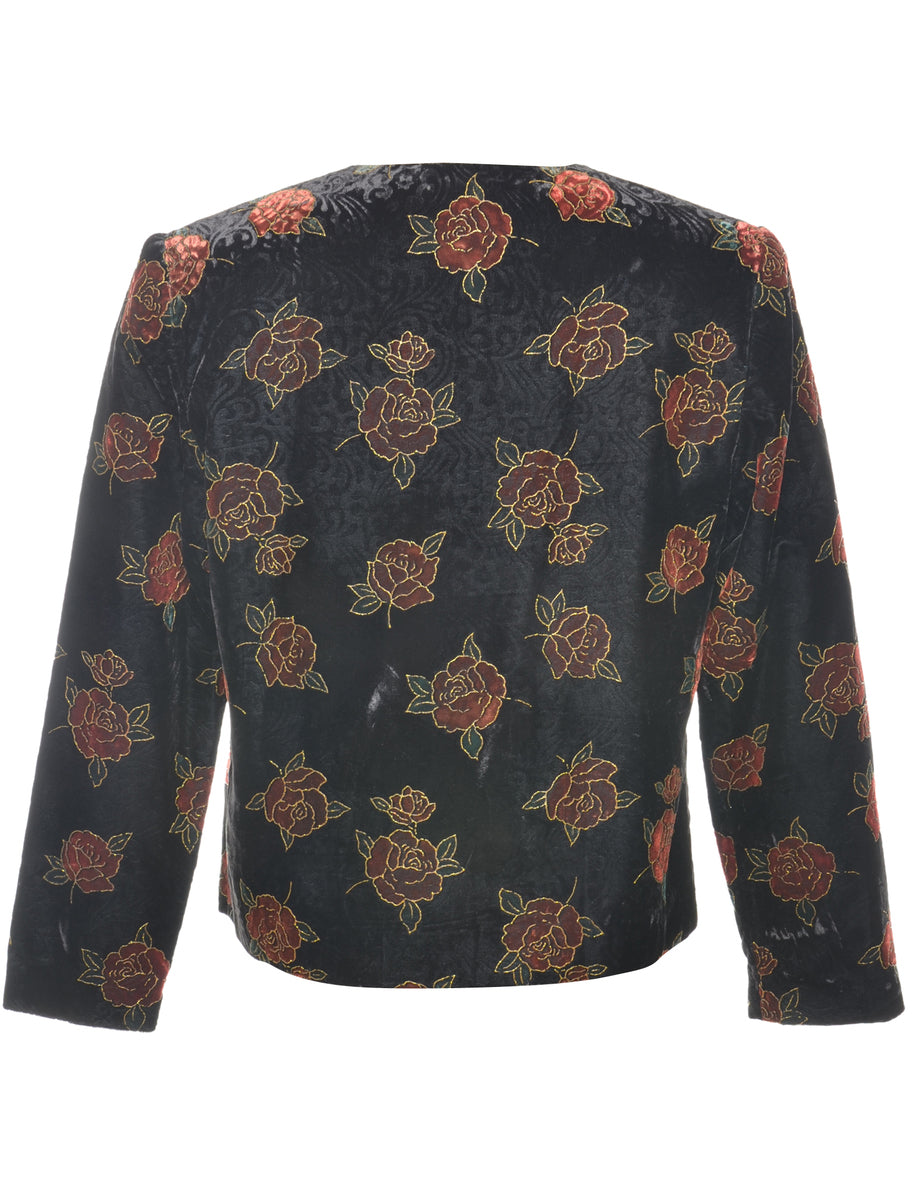 Velvet evening jacket with floral print. Comes in black with full lining and built in shoulder pads.