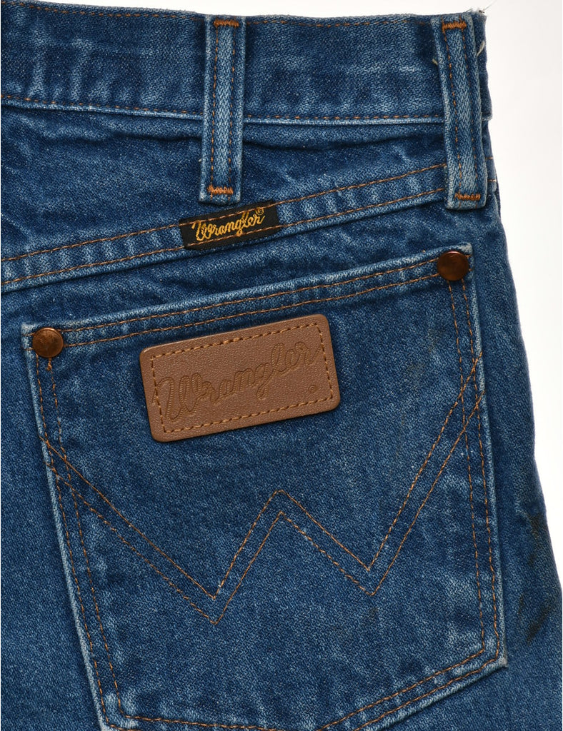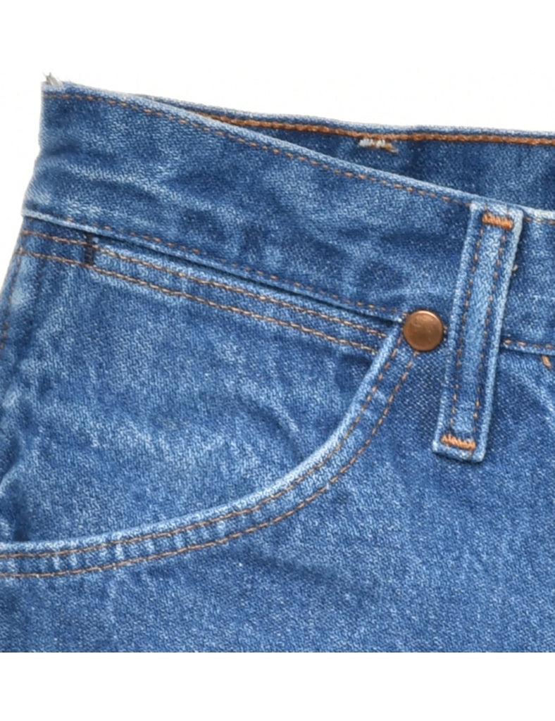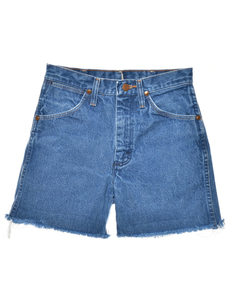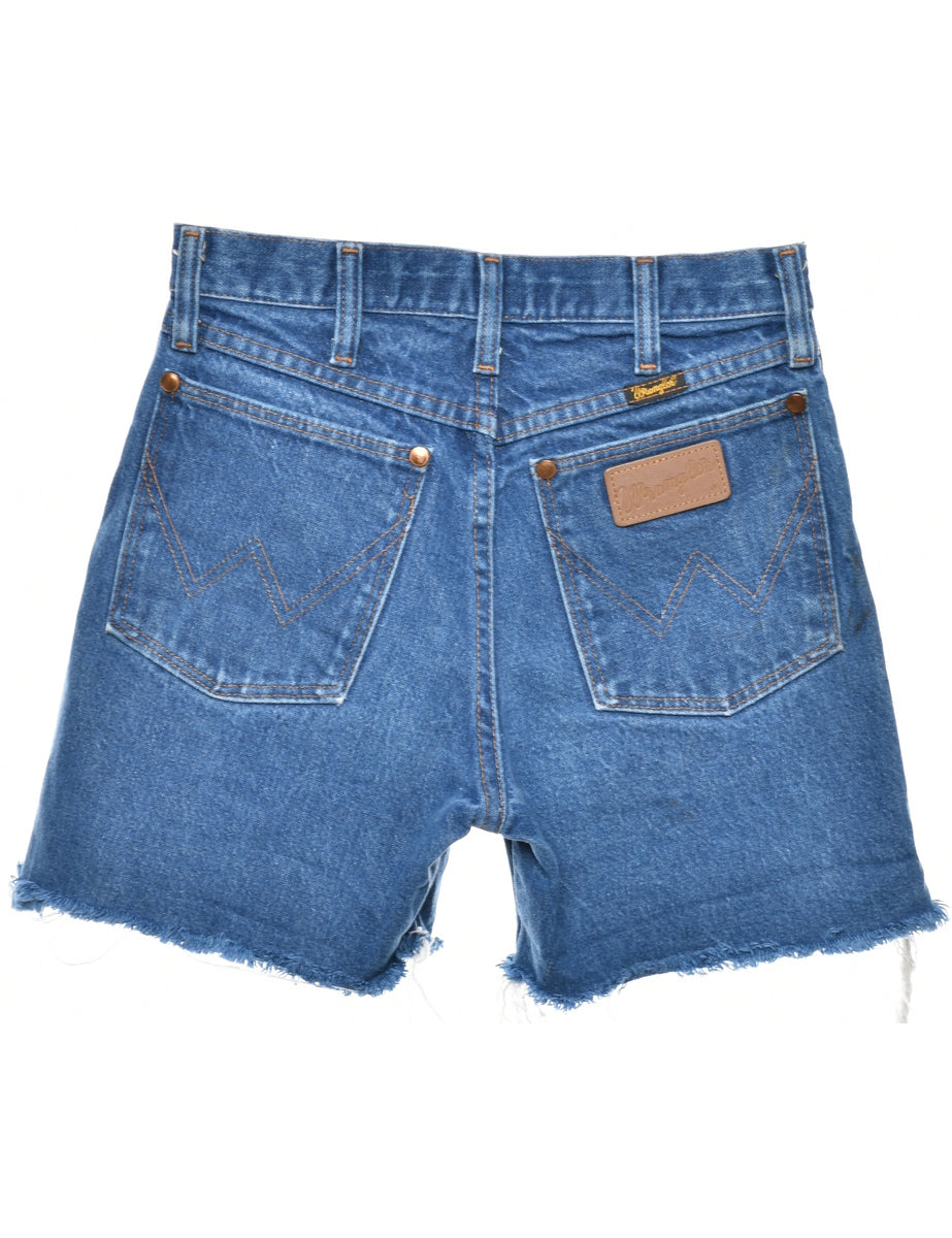 Denim shorts in medium wash with a frayed hem and belt loops. From the brand Wrangler.